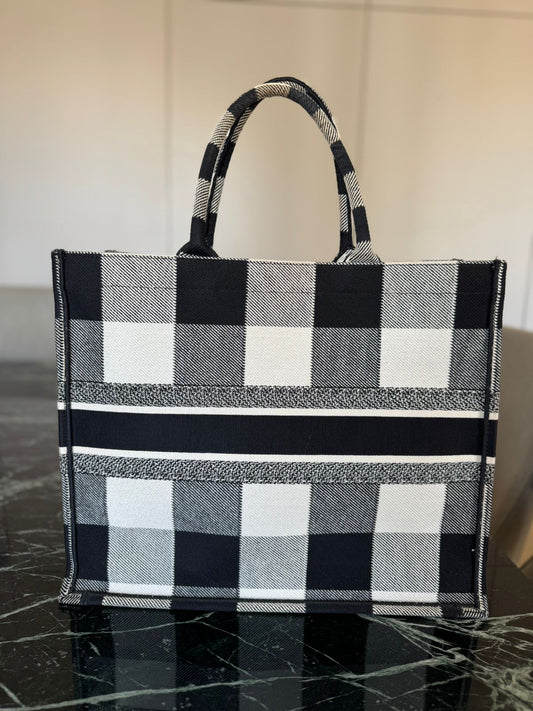 Bolsa Christian Dior Book Tote Xadrez Preta e Branca