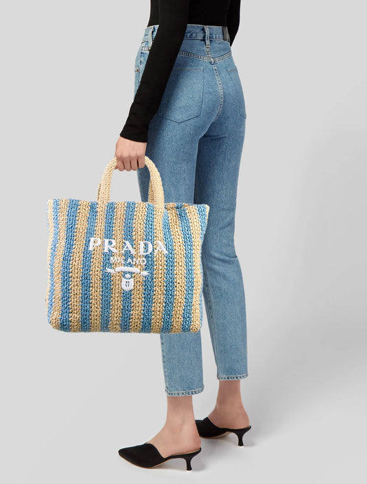 Bolsa Prada Striped Tote Ráfia Azul