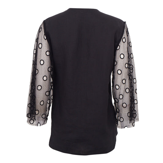 Blusa Paula Raia Preta em Linho c/ Mangas em Renda e Recortes Tam.36