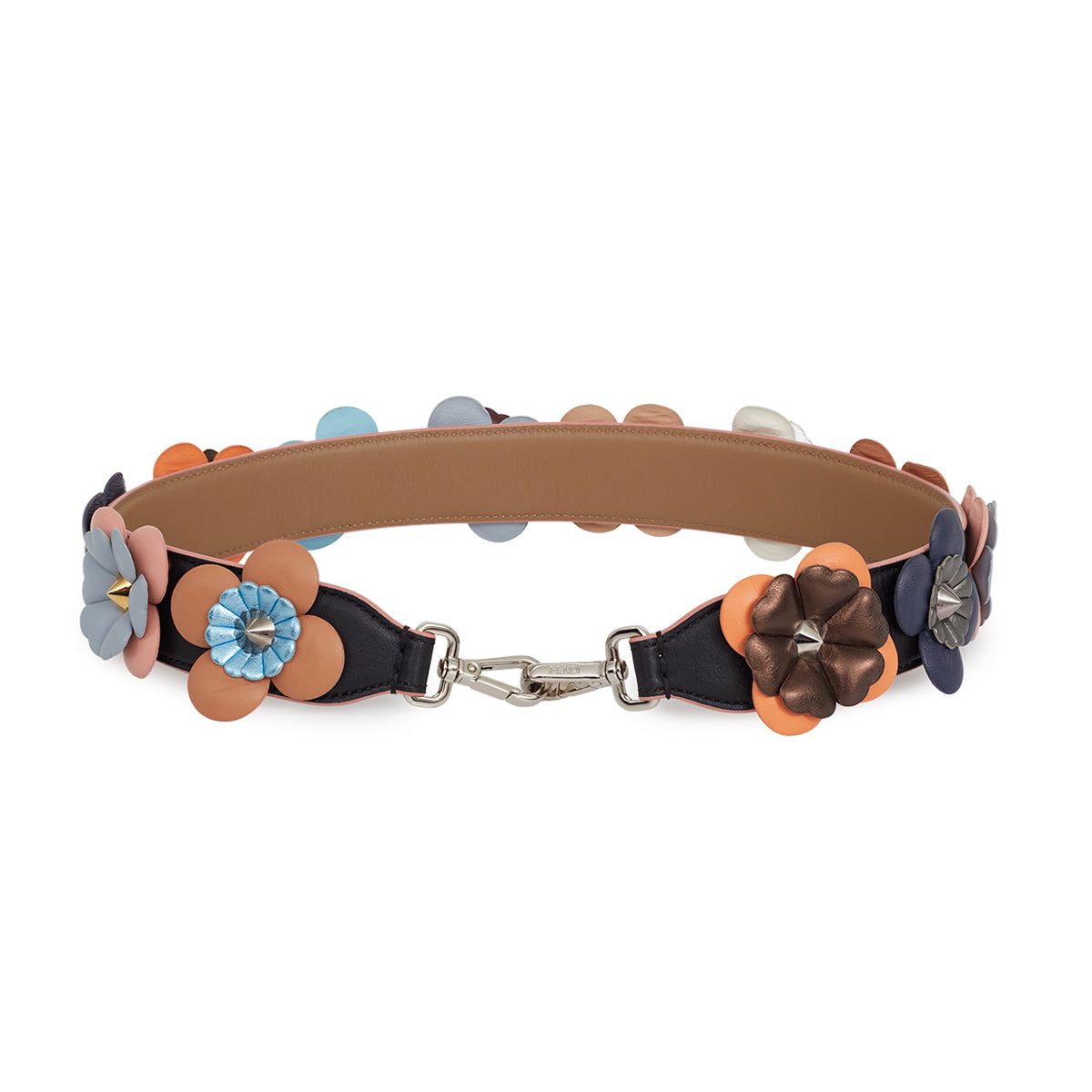 Detalhes: Alça Fendi confeccionada em couro na cor preta com com aplicação de flores em couro coloridas e spikes. Mosquetão prateado. Acompanha dust