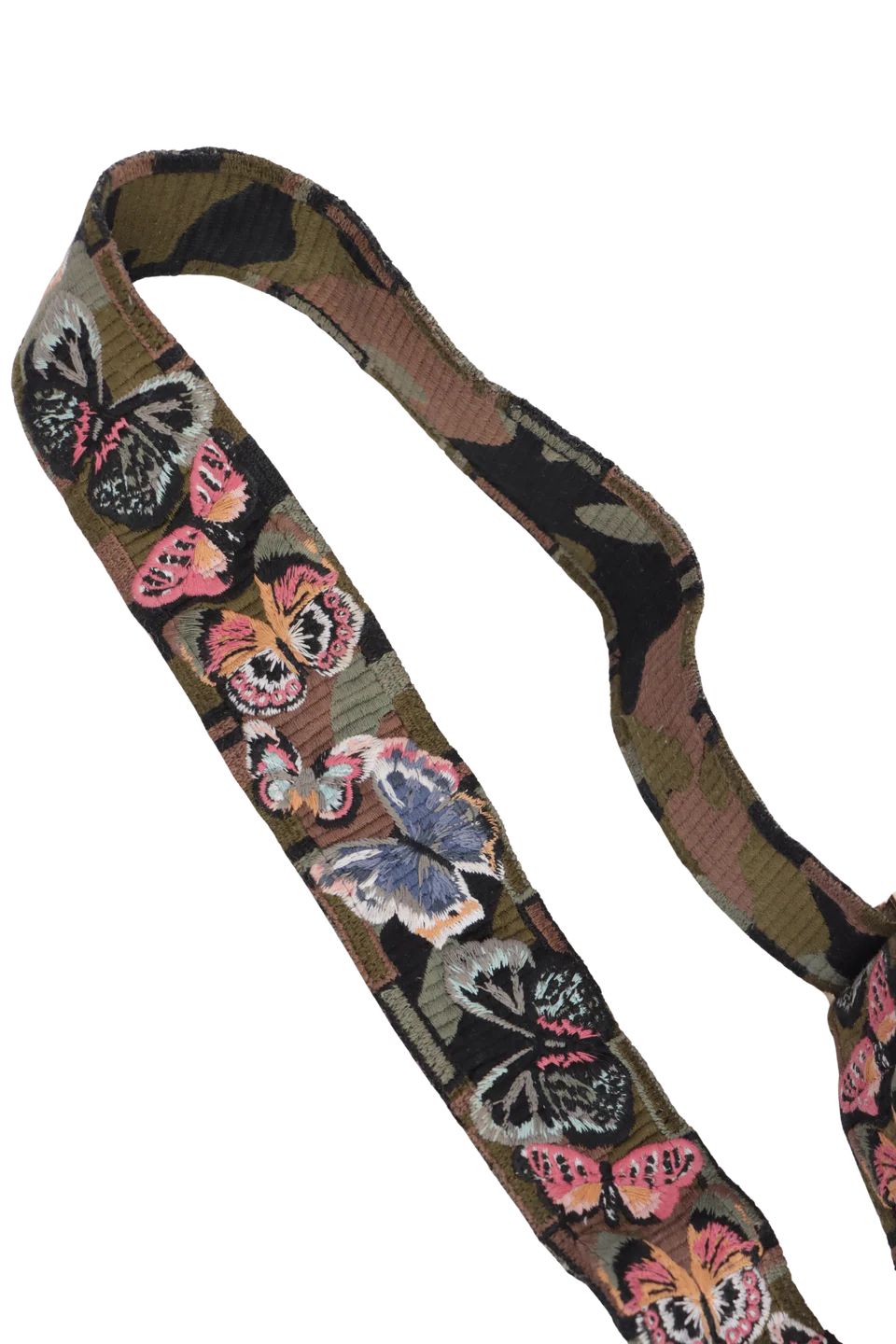Detalhes: A alça é feita de tecido de bordado com borboletas. As cores incluem preto, verde, rosa, amarelo, azul. com detalhes em couro preto. As ferragens, incluindo os mosquetões de encaixe, têm um acabamento em tom de prata envelhecido.