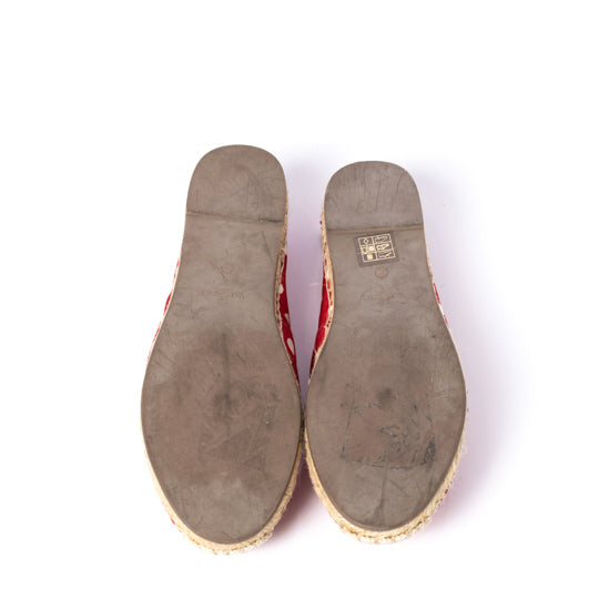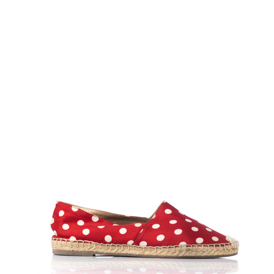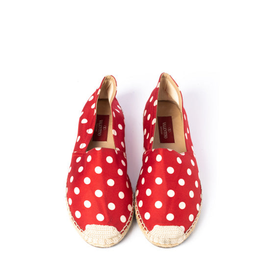 Detalhes: Alpargata Valentino Vermelho Poá Tam. 36. O modelo possui entressola em sisal, bico arredondado, cap toe em crochê na cor bege e extremidades com acabamento em tecido e vermelho.
