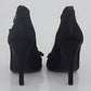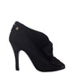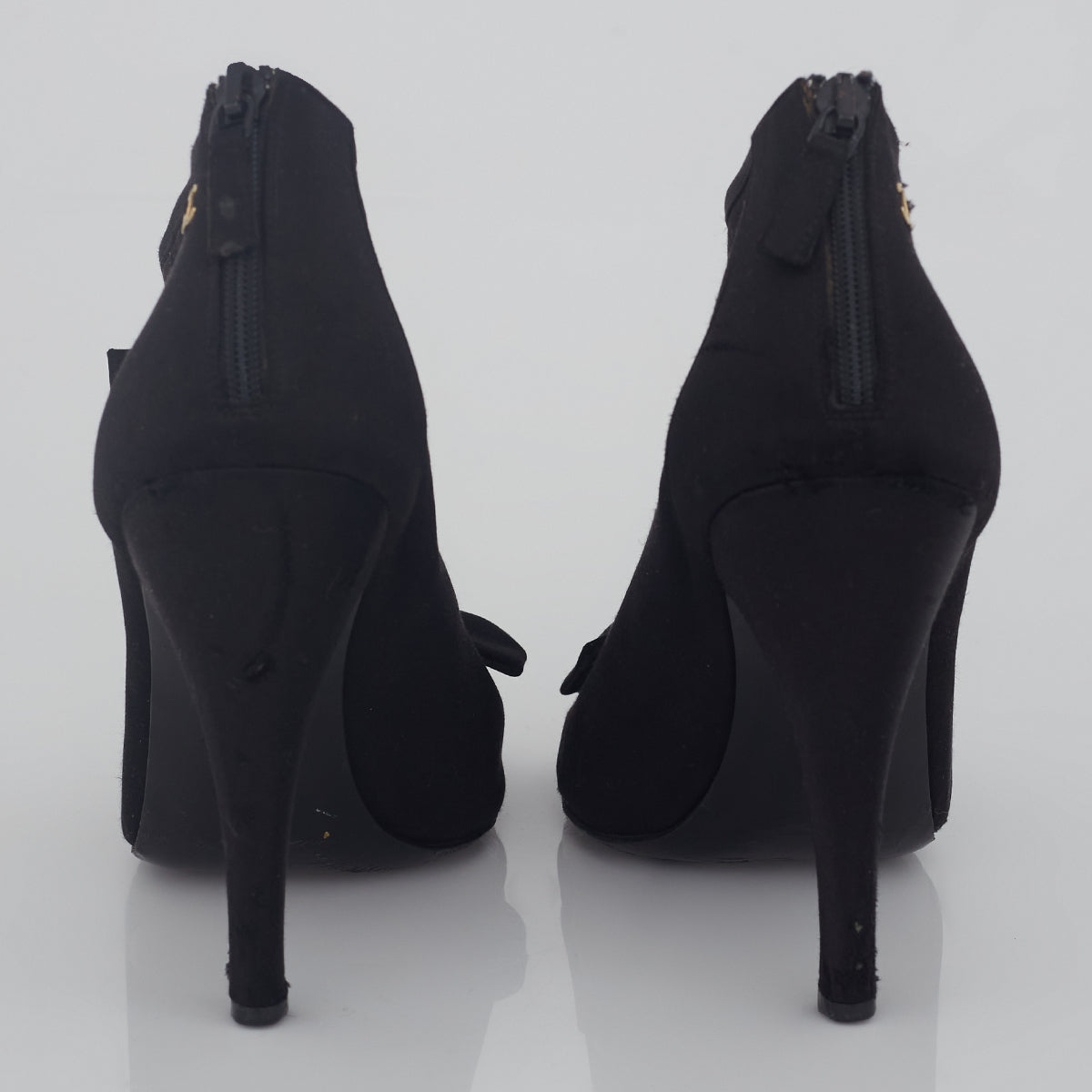 Detalhes: Modelo confeccionado em cetim preto. Possui abertura frontal, cano médio, detalhe de laços frontais, salto alto fino e monograma da marca em metal dourado na lateral. Fecho em zíper no calcanhar.