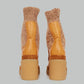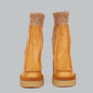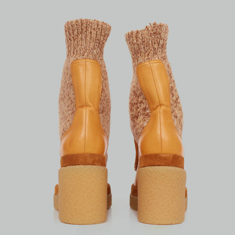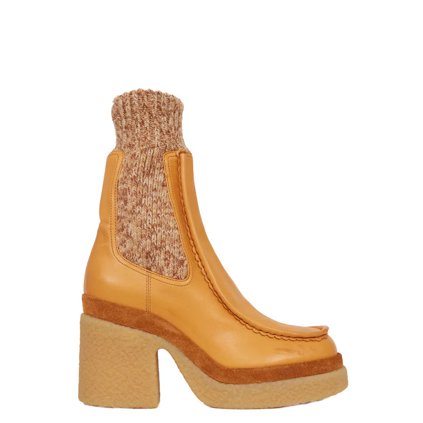 Detalhes: Bota Chloé confeccionada em couro na cor bege. Modelo possui bico arredondado, salto bloco médio em borracha, plataforma, detalhe em suede e cano meia em tricô