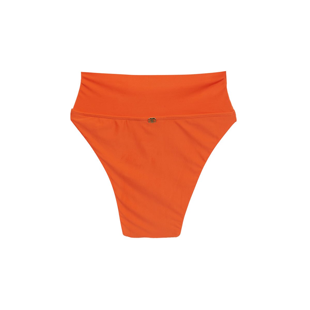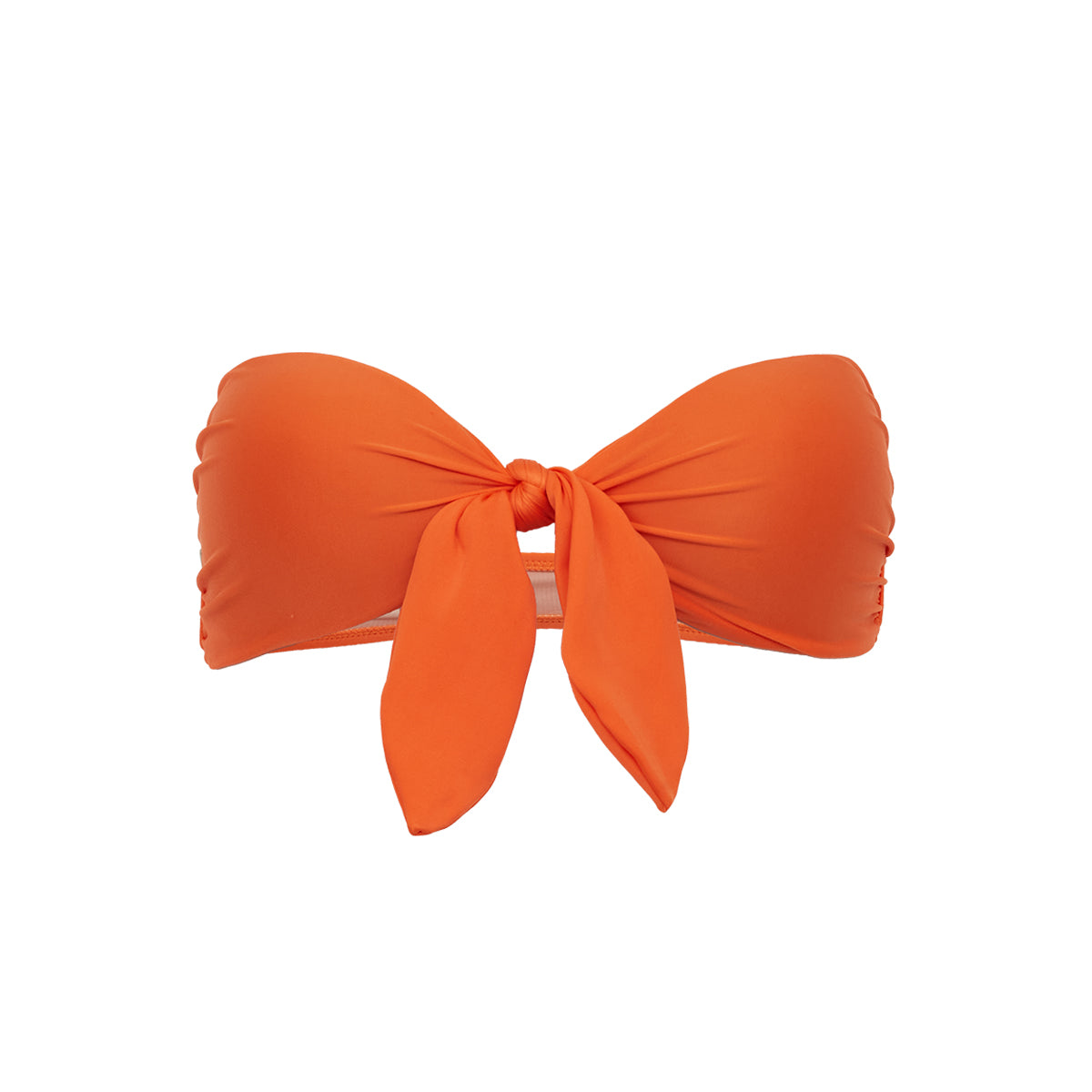 Detalhes: Biquíni Adriana Degreas confeccionado na cor laranja, tomara que caia com amarração frontal e bojo. Calcinha cintura alta com detalhe dourado.