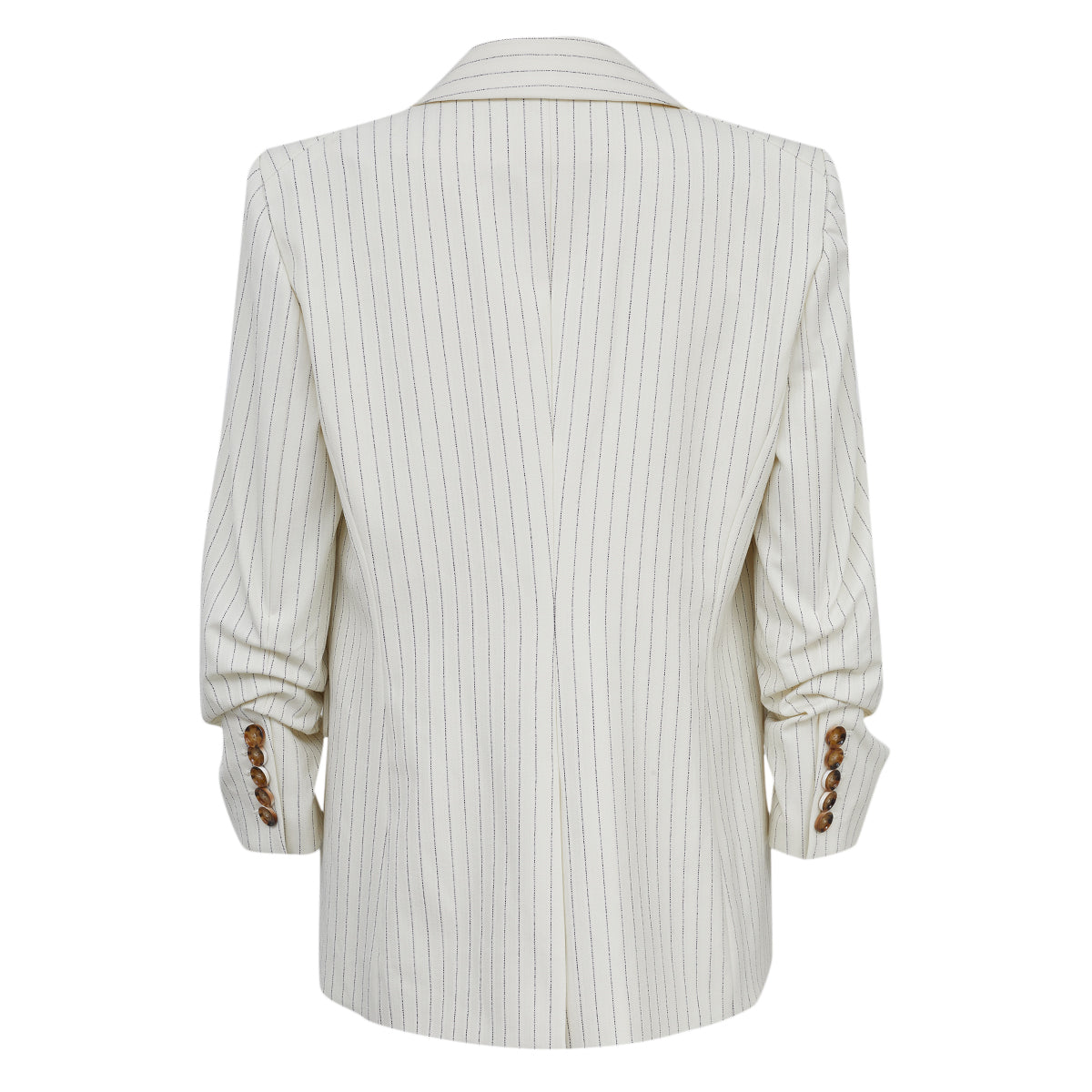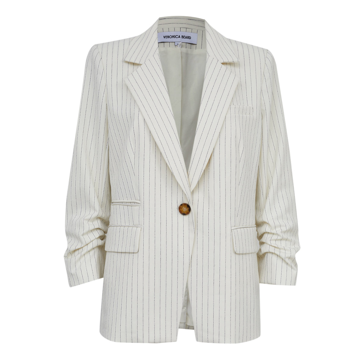 Detalhes: Blazer Veronica Beard Off White com listras finas verticais na cor preta, confeccionado em Poliéster, Elastano e Viscose. Possui modelagem levemente alongada, lapela clássica e fechamento frontal por botão único. Conta com três bolsos frontais decorativos com fechamento em botões e as mangas apresentam leve franzido.