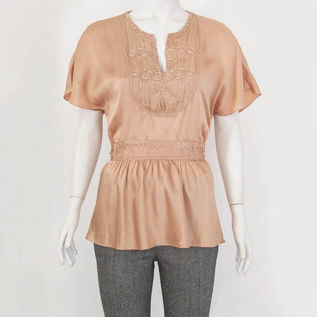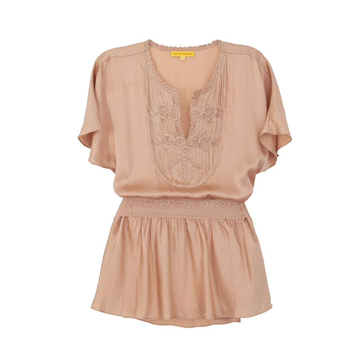 Detalhe: Blusa Catherine Malandrino Nude Seda Tam. S. Modelo de seda com bordados no colo bordado, com cinto de amarrar na cintura.