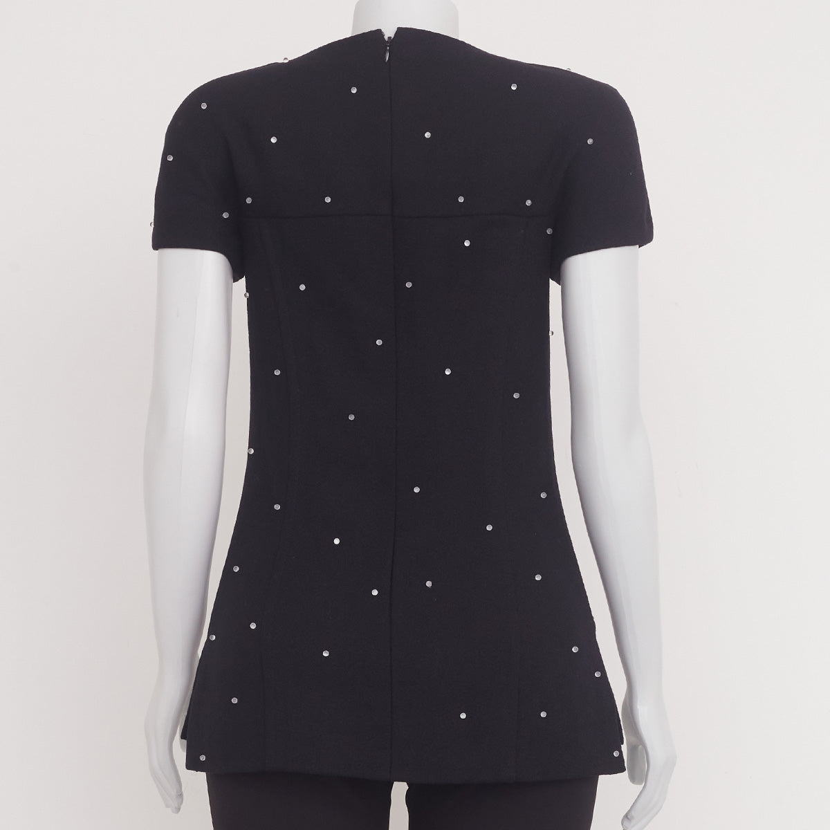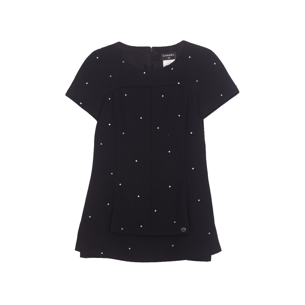 Detalhes: Blusa Chanel preta com detalhes de aplicações, possui gola redonda, mangas curtas, recortes, fecho dianteiro por zíper invisível.