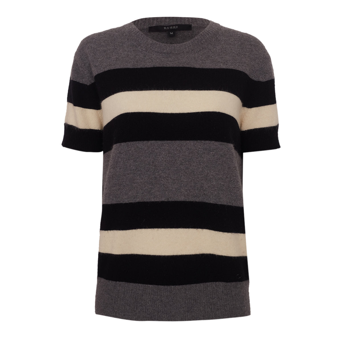 Detalhes: Blusa Gucci em tricot confeccionada em lã em base cinza com listras grossas nas cores preta e off-white. Em modelagem ampla, com gola redonda canelada, mangas curtas e detalhe canelado na barra. Ferragem GG na cor preta aplicada na parte inferior.