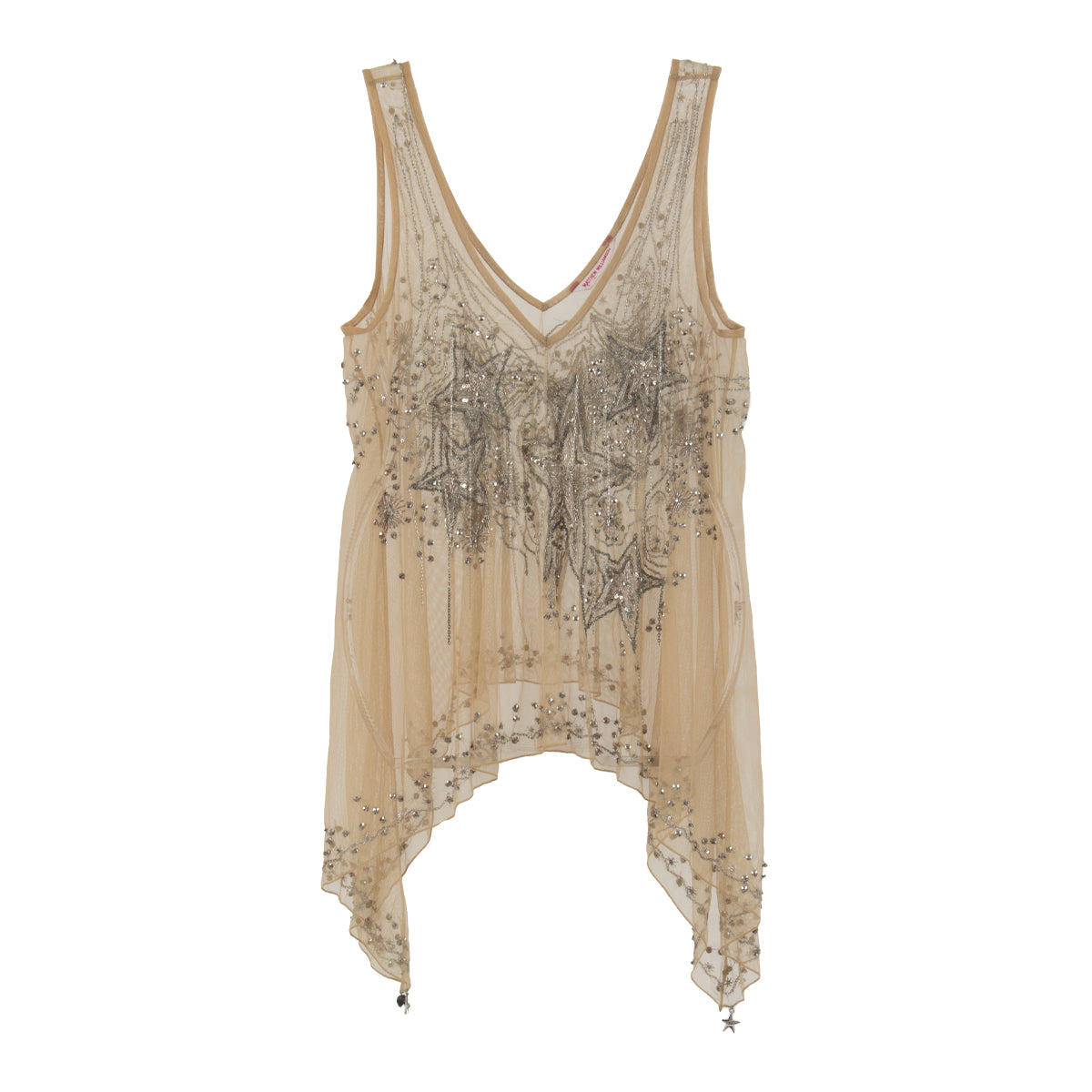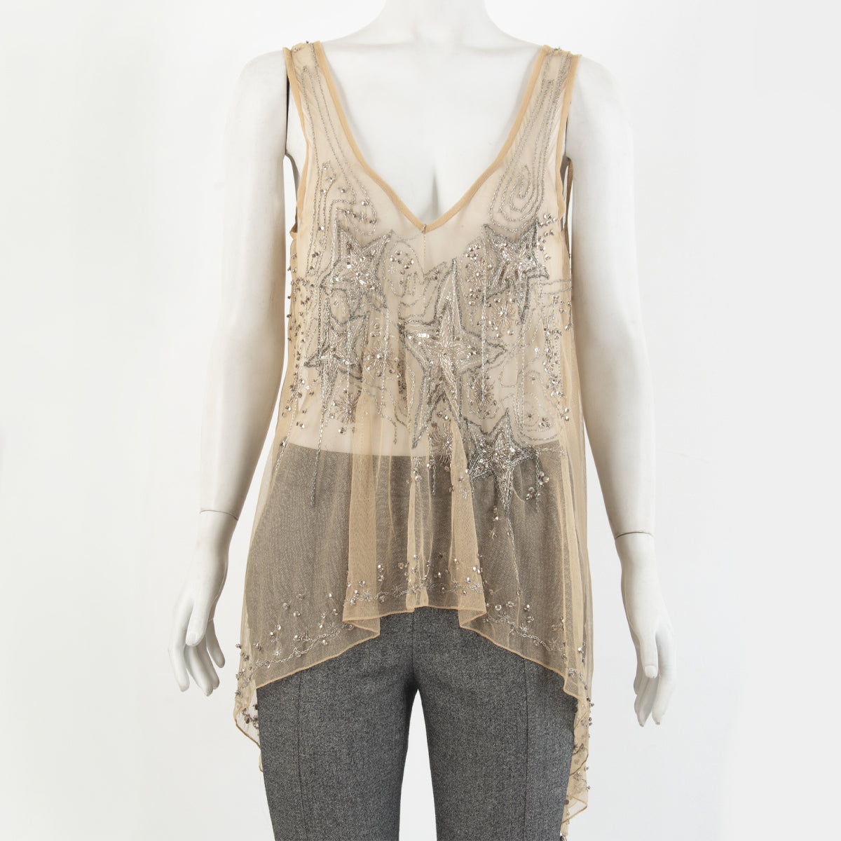 Detalhes: Blusa Matthew Williamson Tule Com ferragens Bege Tam. P. Modelo com manga regara e estrelas bordadas na ferragens prata com tule bege. Nao acompanha forro