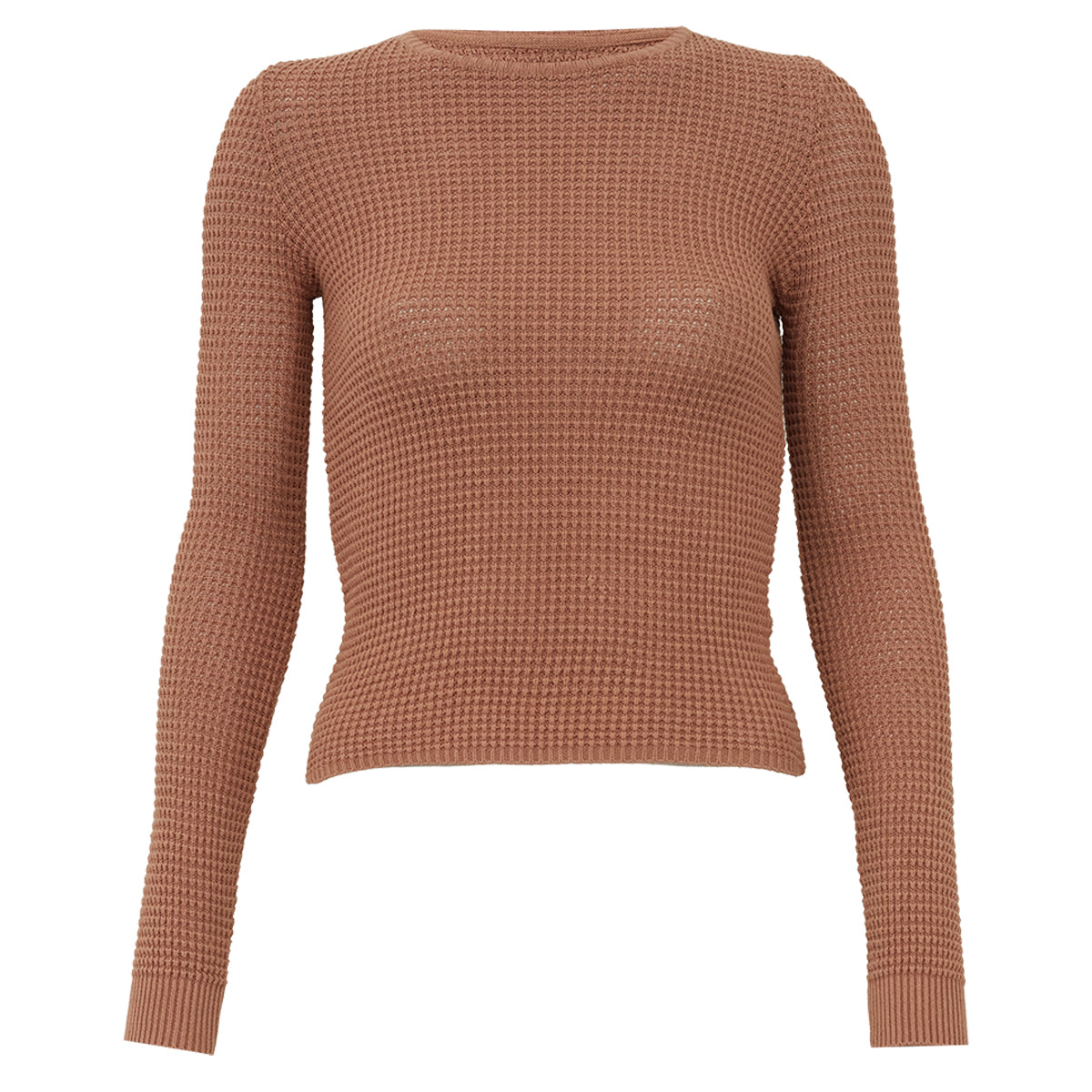 Detalhes: Blusa Paula Raia marrom texturizada. Modelo com mangas longas, gola redonda, detalhe no punho e barra e leve transparência.