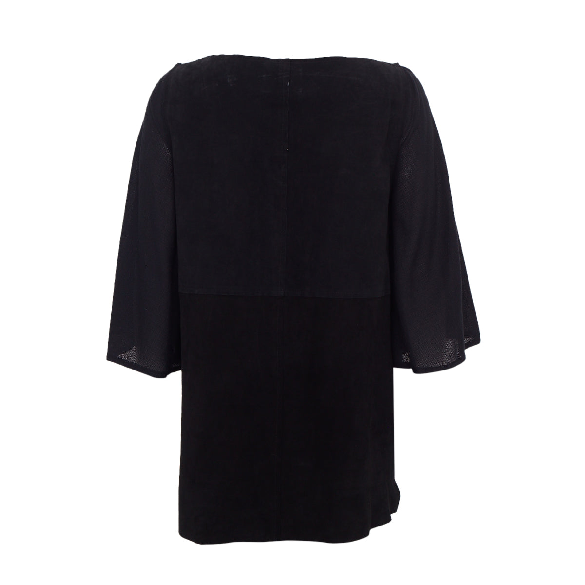 Detalhes: Blusa Paula Raia confeccionada em algodão na cor preta com detalhes em couro nas costas. Em modelagem ampla mullet, com decote canoa alto e mangas 3/4 raglam. Corpo com pregas espaçadas e costas em couro suede na cor preta.