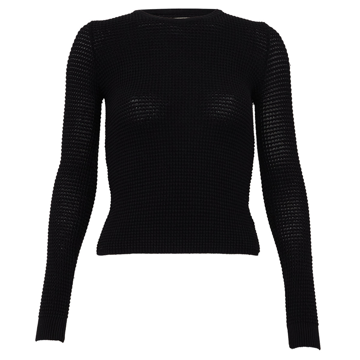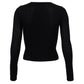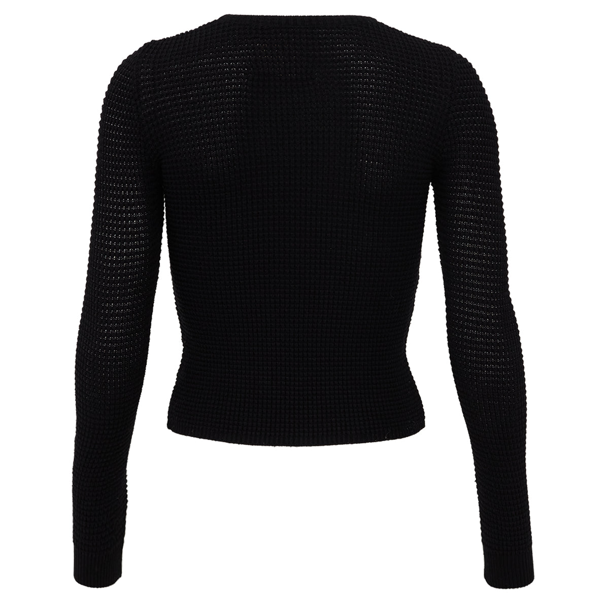 Detalhes: BlusaPaula Raia Preto Texturizado. Modelo com mangas longas, gola redonda, detalhe no punho e barra e leve transparência.