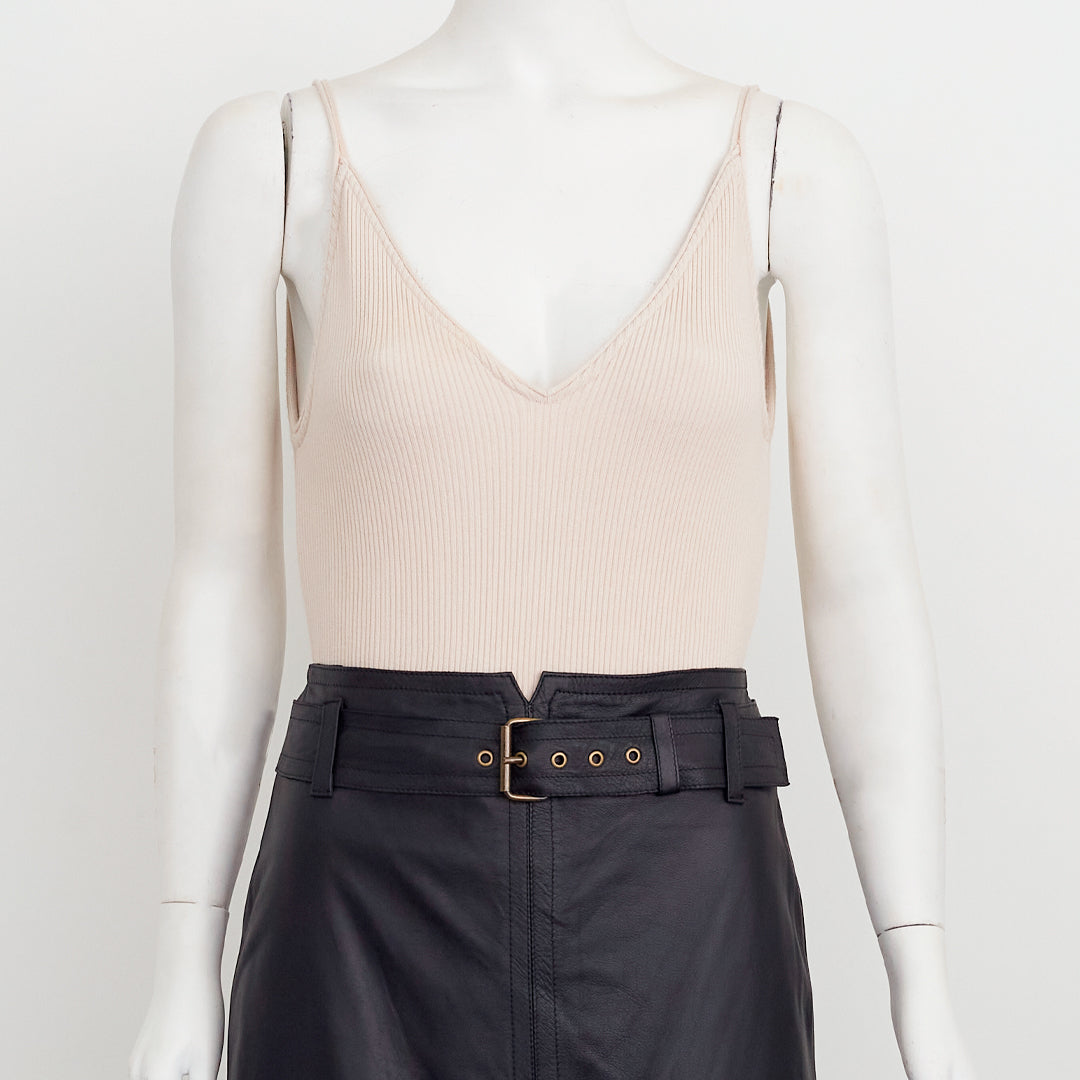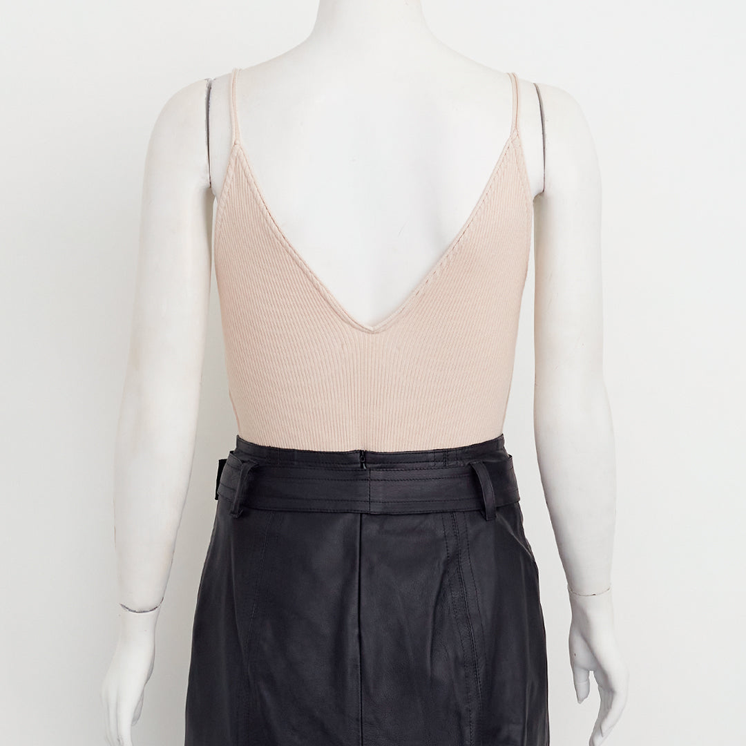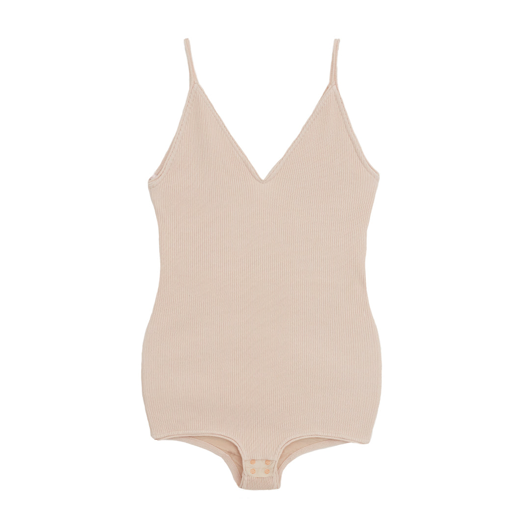 Detalhes: Body Cris Barros canelado na cor nude. Possui decote v alongado frente e costas, alças finas e detalhe em viés.