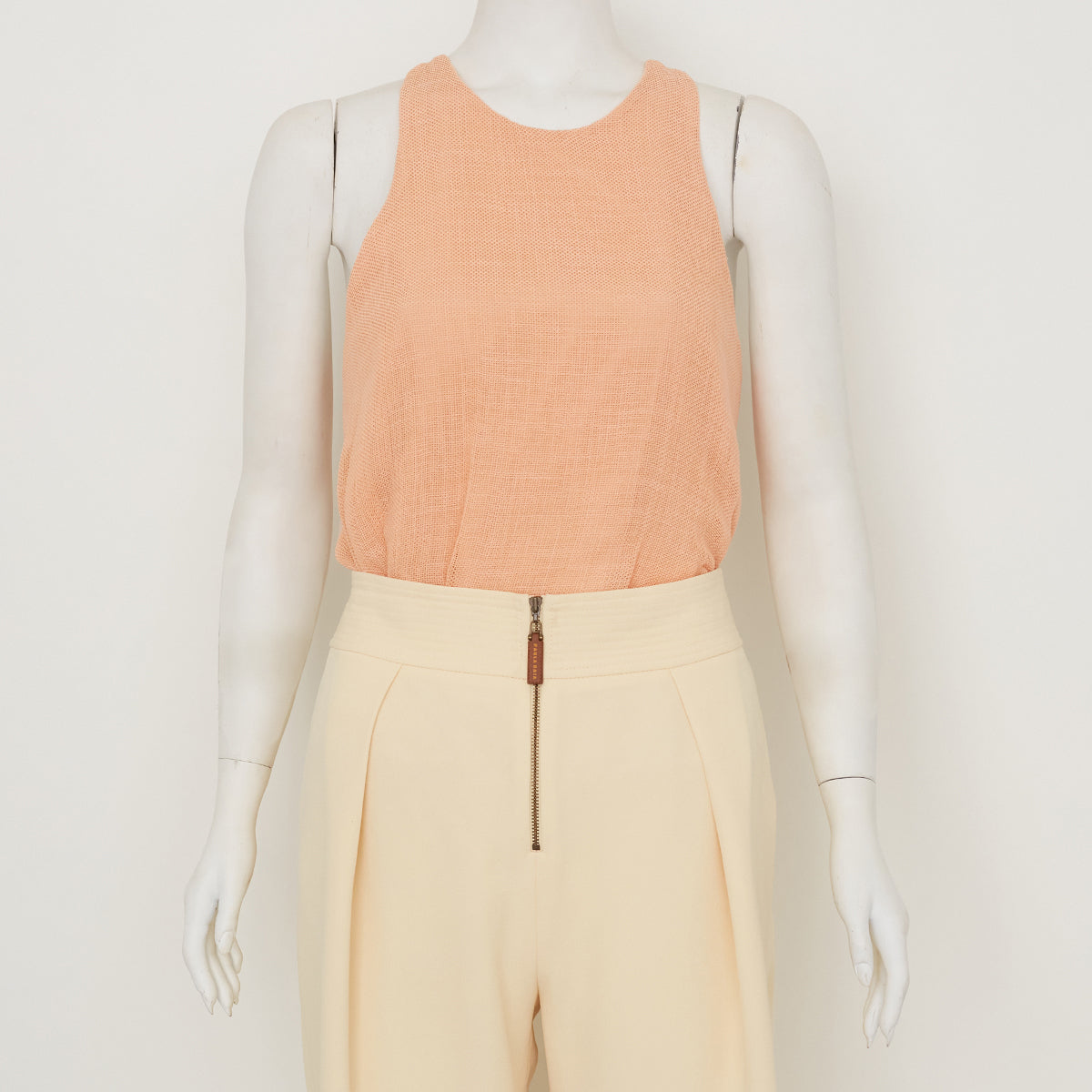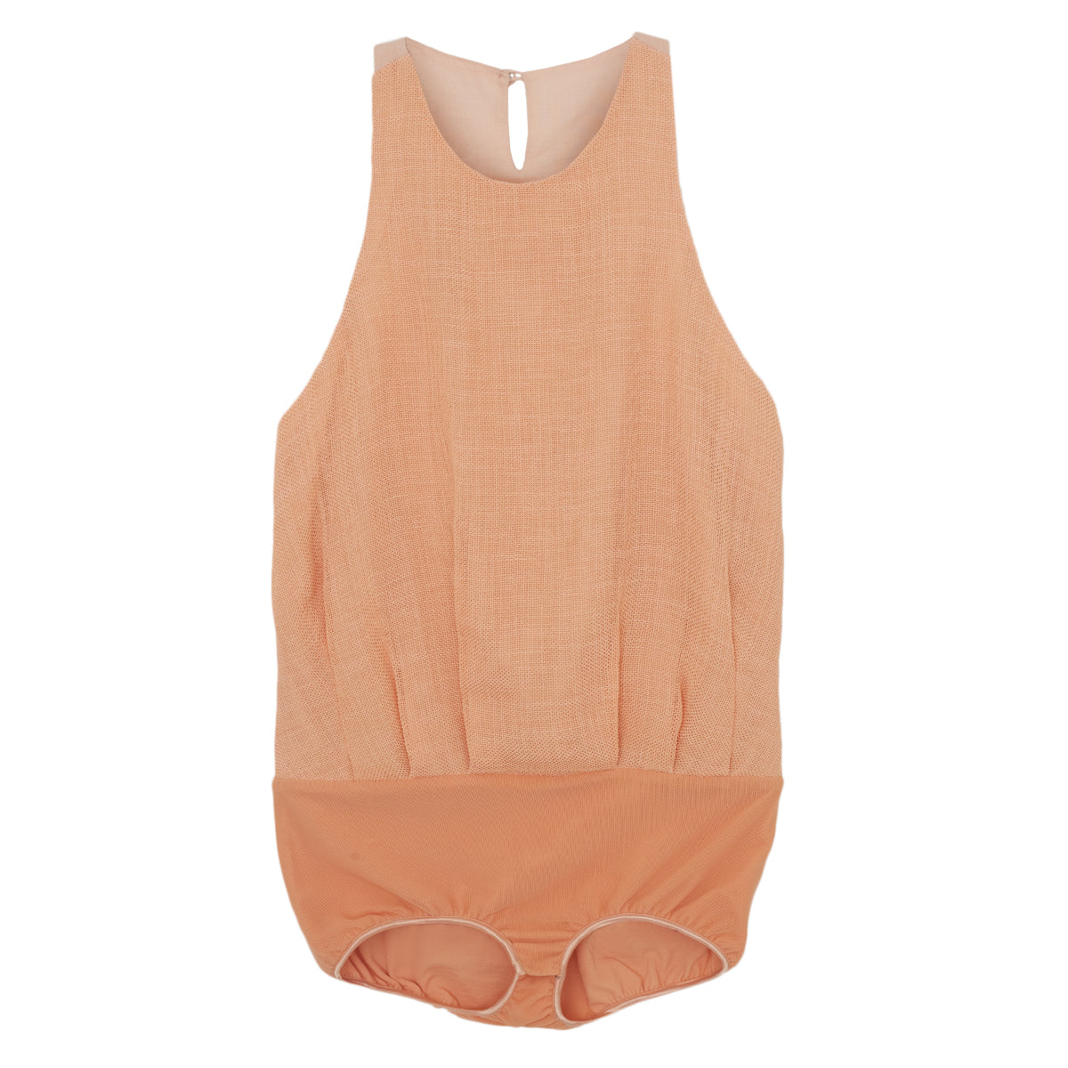 Detalhes: Body Paula na cor coral. Possui modelagem regata, decote redondo,pregas aplicadas abaixo da cintura e parte traseira com recorte arredondado.Fechamento por colchete de encaixe.