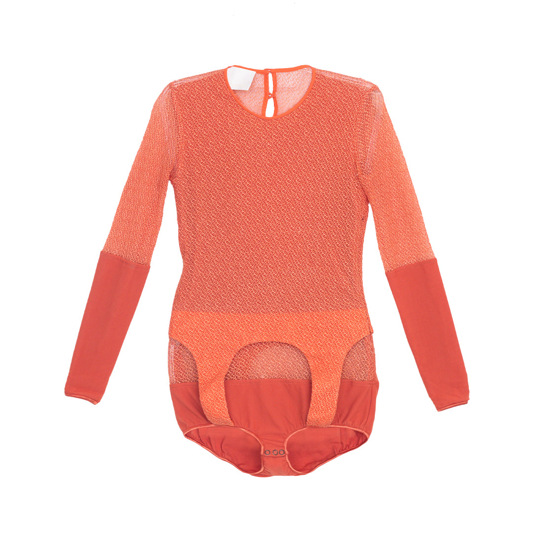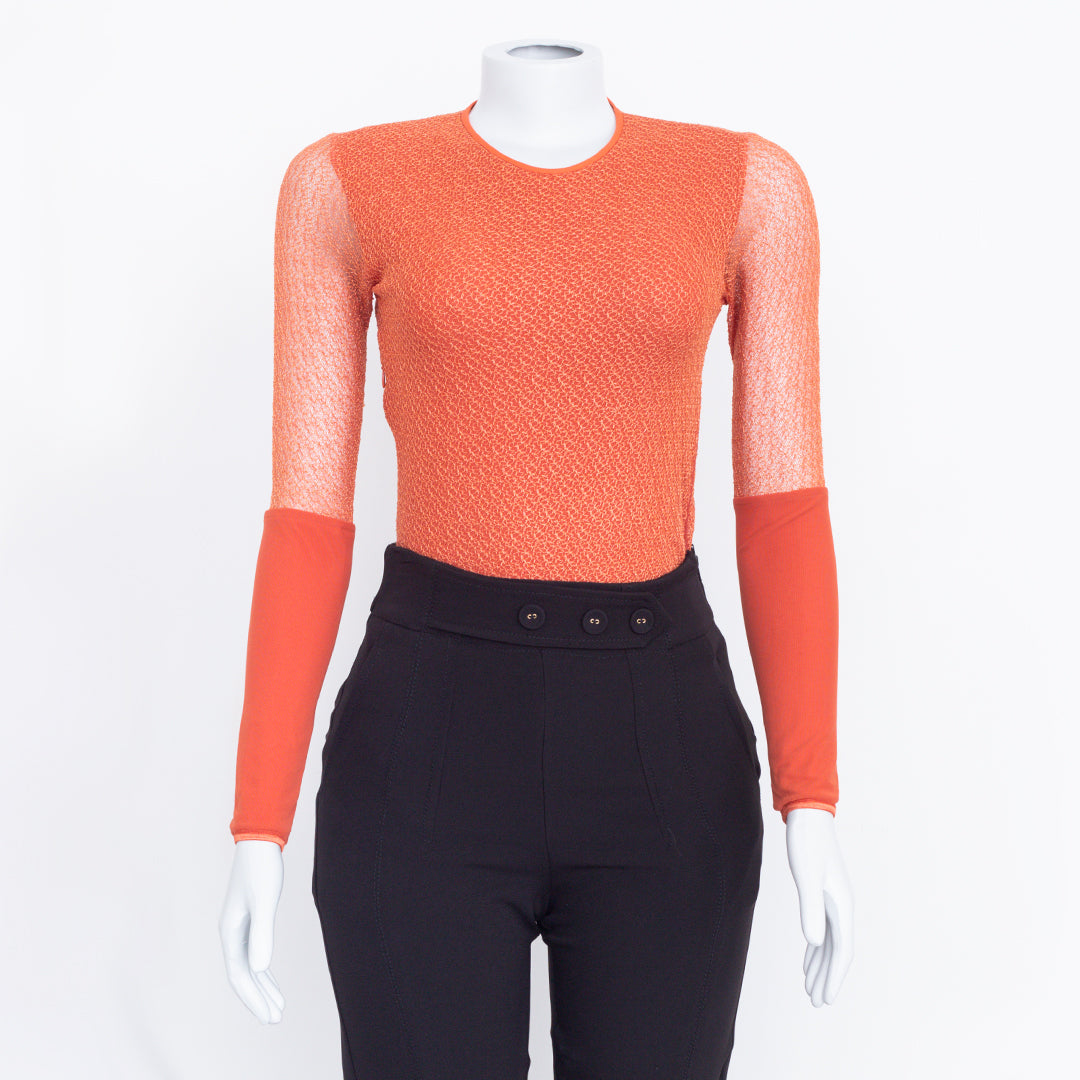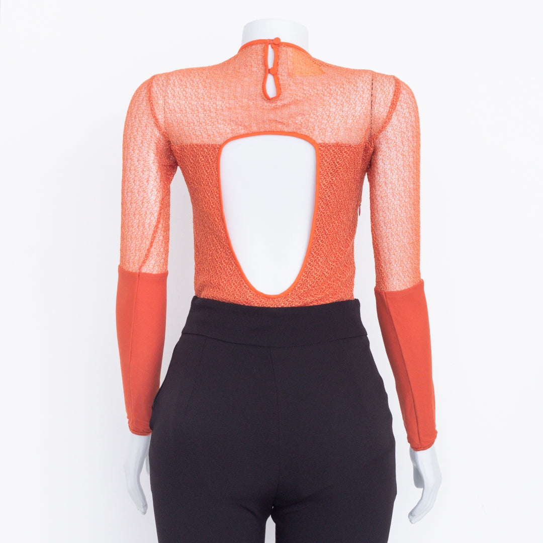 Detalhes: Body Paula Raia na cor laranja com aplicação de tule texturizado na parte superior frontal e traseira. Possui decote redondo alto, mangas longas, fechamento em botão.