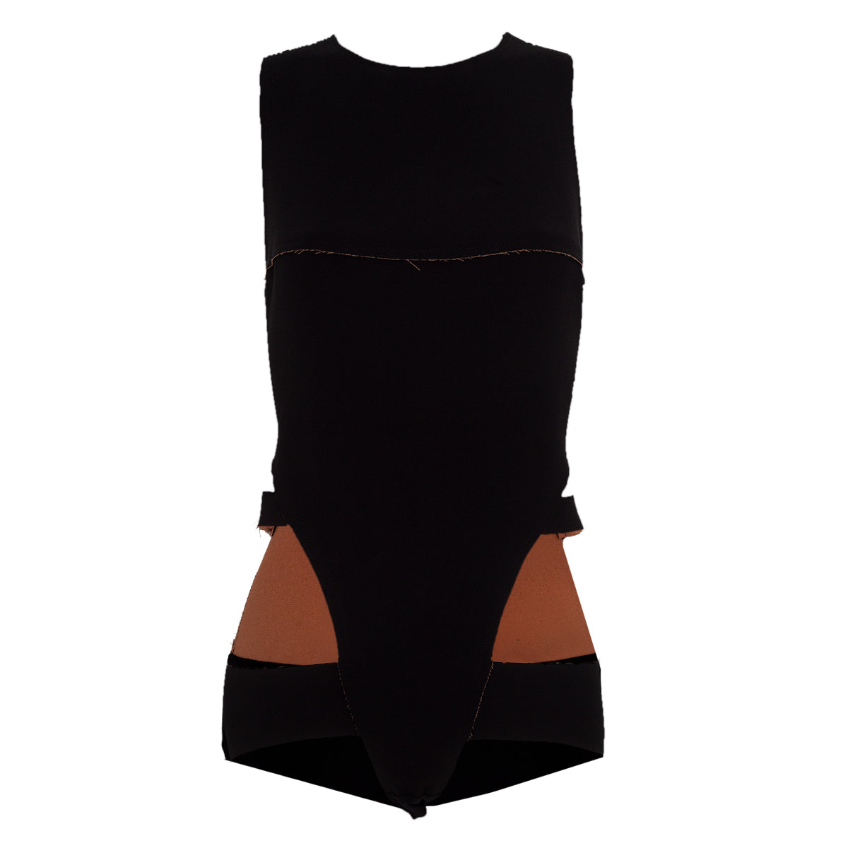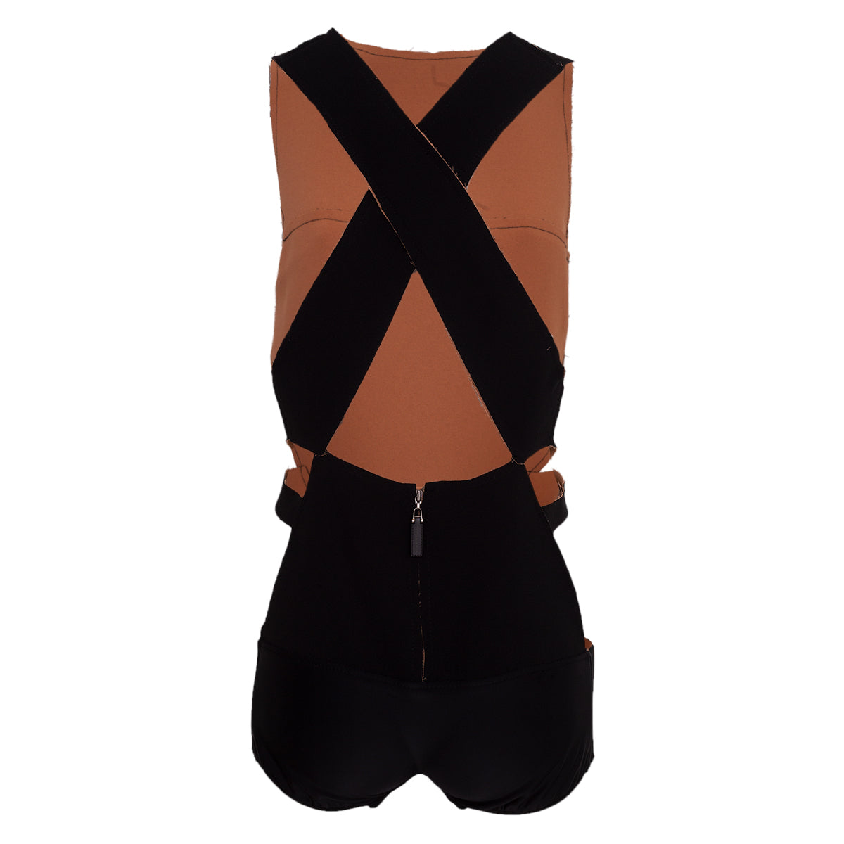 Detalhes: Body Paula Raia preto com recorte X nas costas e recortes nas laterais. Possui ziper aplicado na parte de trás da peça e forro na cor nude.