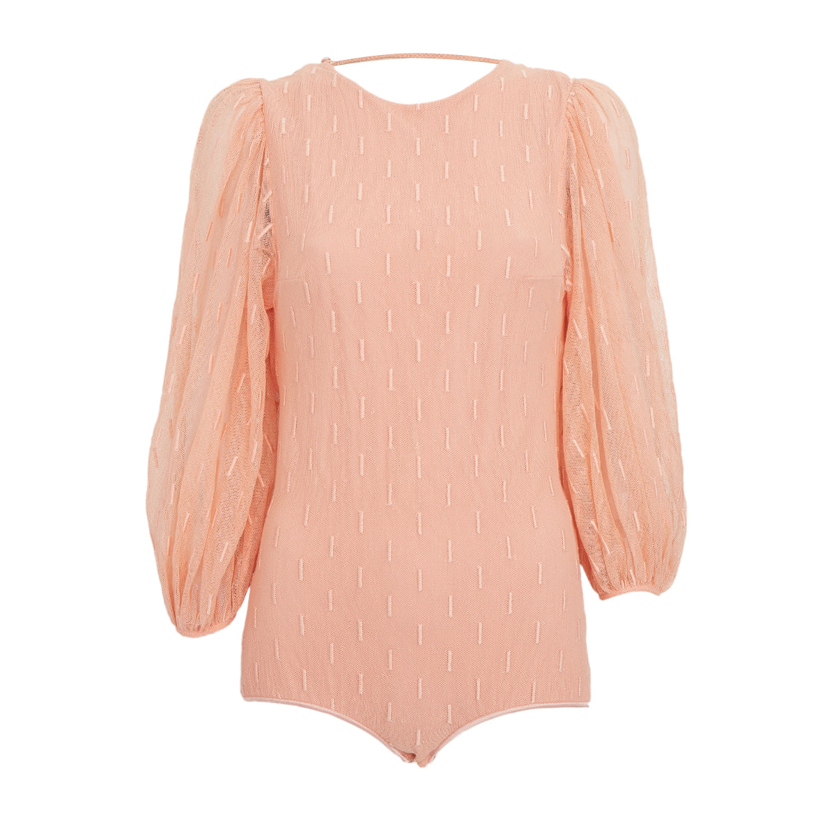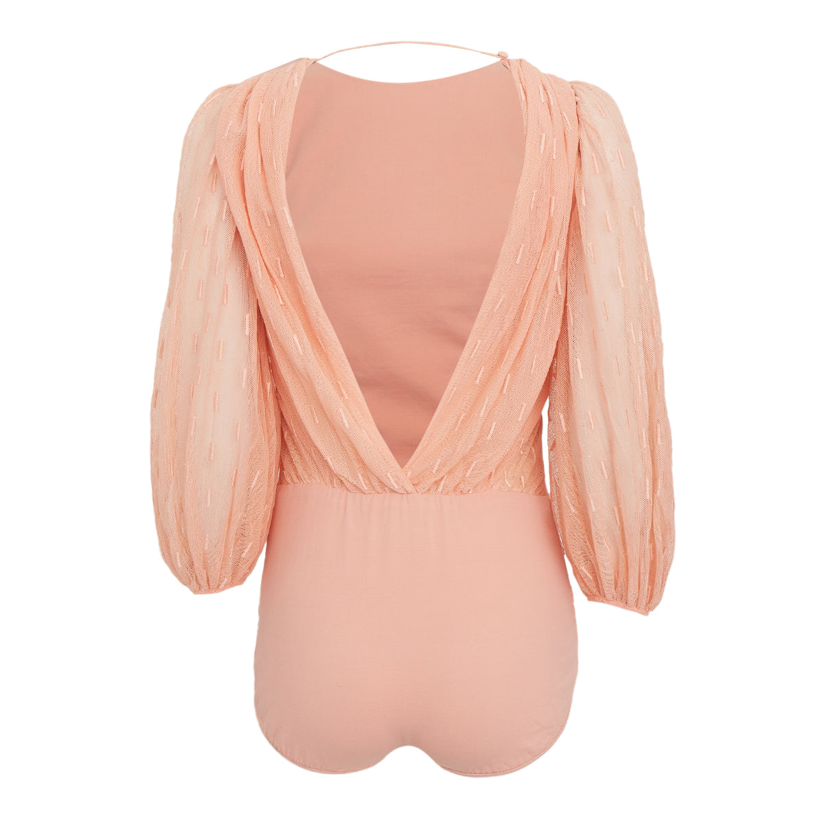Detalhes: Body Paula Raia na cor salmão com mangas bufantes. Possui decote frontal redondo e decote traseiro alongado em v, manga com transparência e fechamento em colchetes de encaixe.