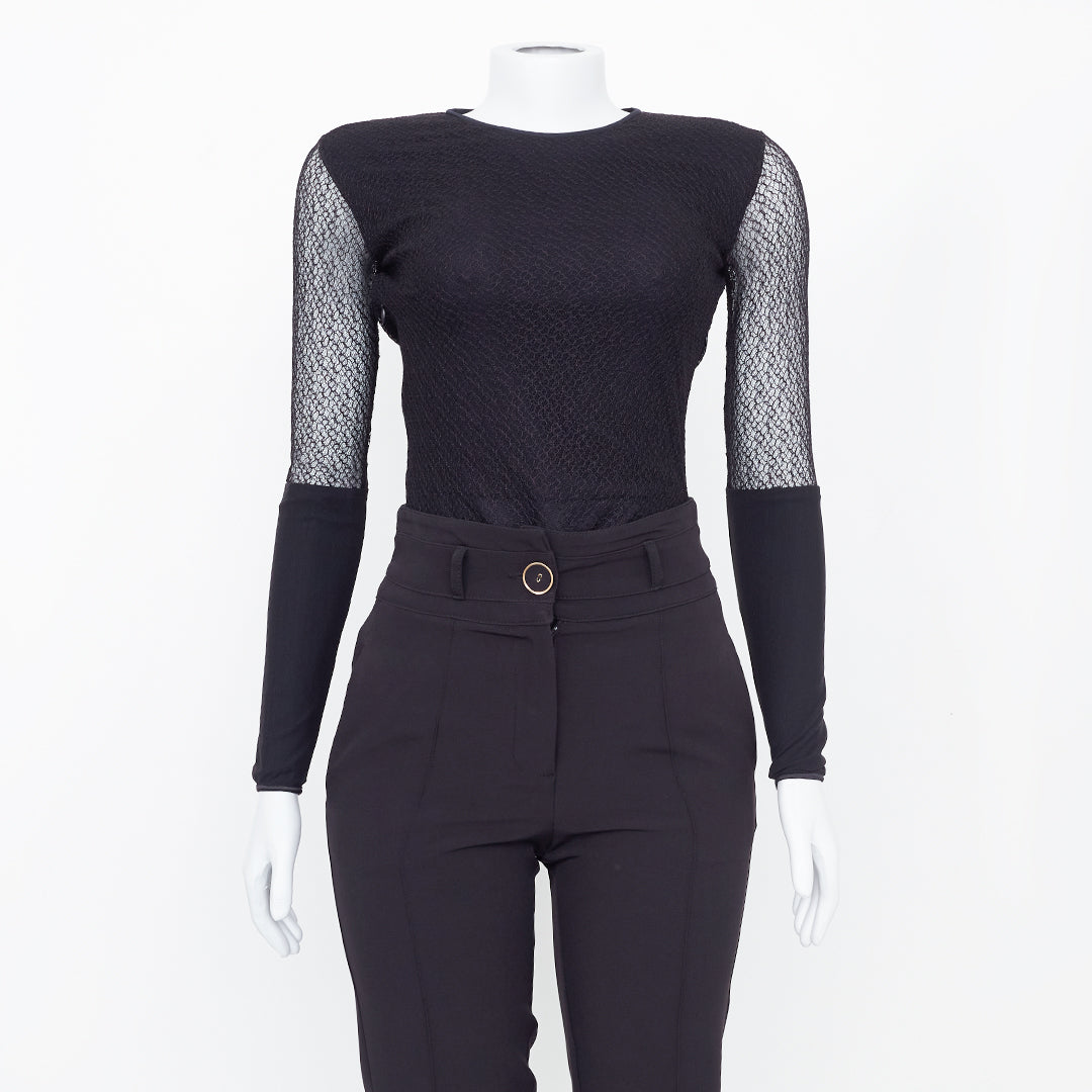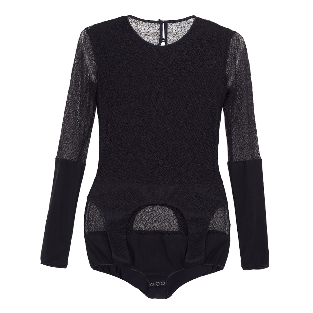 Detalhes: Body Paula Raia na cor preto com aplicação de renda. Possui decote redondo alto, mangas longas, fechamento em botão e costas abertas.