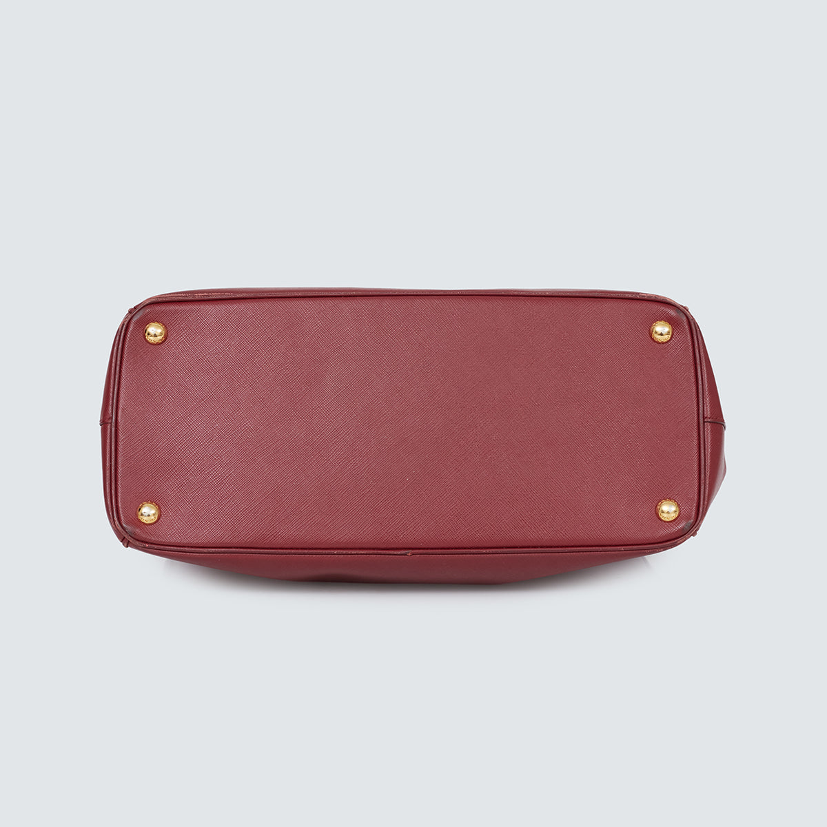 Detalhes: bolsa na cor marsala em couro saffiano, quatro bolsos internos sendo um com fecho zíper, dois bolsos externos com fecho zíper, alça dupla de mão, alça longa removível e ajustável, botões para ajustes laterais, metais dourados.