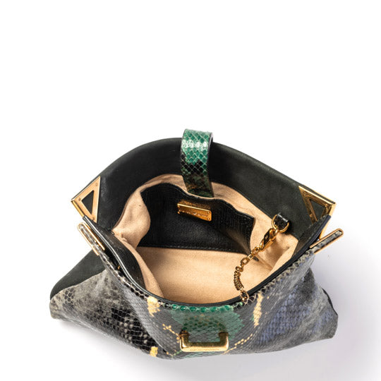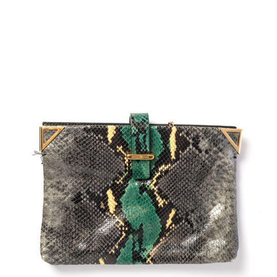 Detalhes: Bolsa Armani confeccionada em couro python e couro liso nas cores preta,verde,amarela e cinca. Possui formato retangular, alça removivel em corrente fina e detalhes em triângulos aplicados aos cantos superiores. Parte interior em suede na cor bege divisória para dois compartimentos,ambos com bolso. Fechamento em tira de encaixe em couro e ferragem dourada com nome da marca.