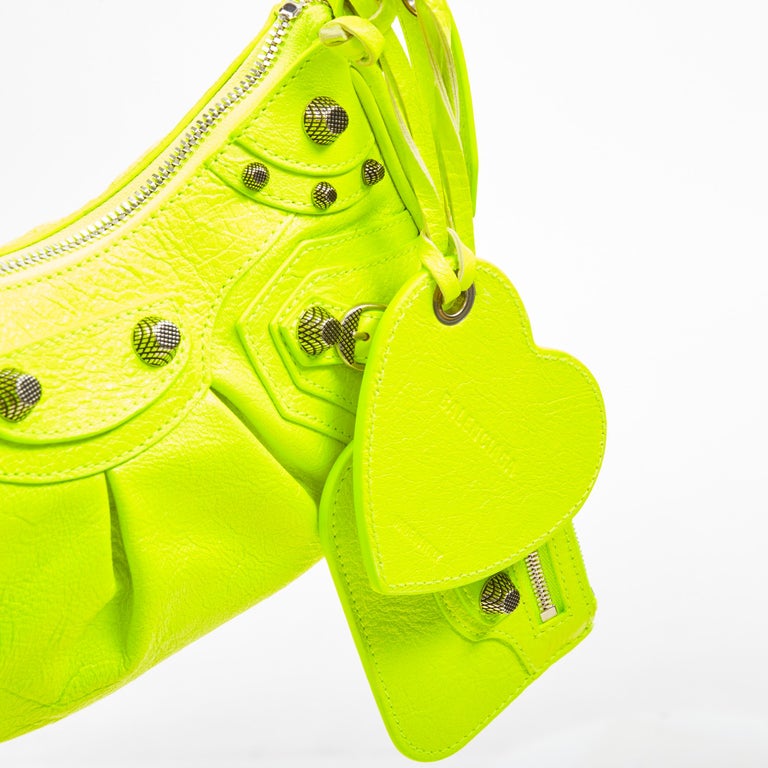 Detalhes: Bolsa Balenciaga Le Cagole confeccionada em couro de bezerro na cor amarela. O modelo possui base arredondada, alça de ombro ajustável, detalhe de fivelas na parte frontal, pingente de espelho em formato de coração e mini necessaire com zíper. Parte interna em tecido preto, conta com compartimento único e placa de logo em couro. Ferragens em prata envelhecida. Fechamento em zíper.