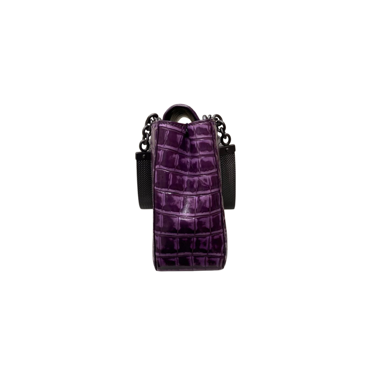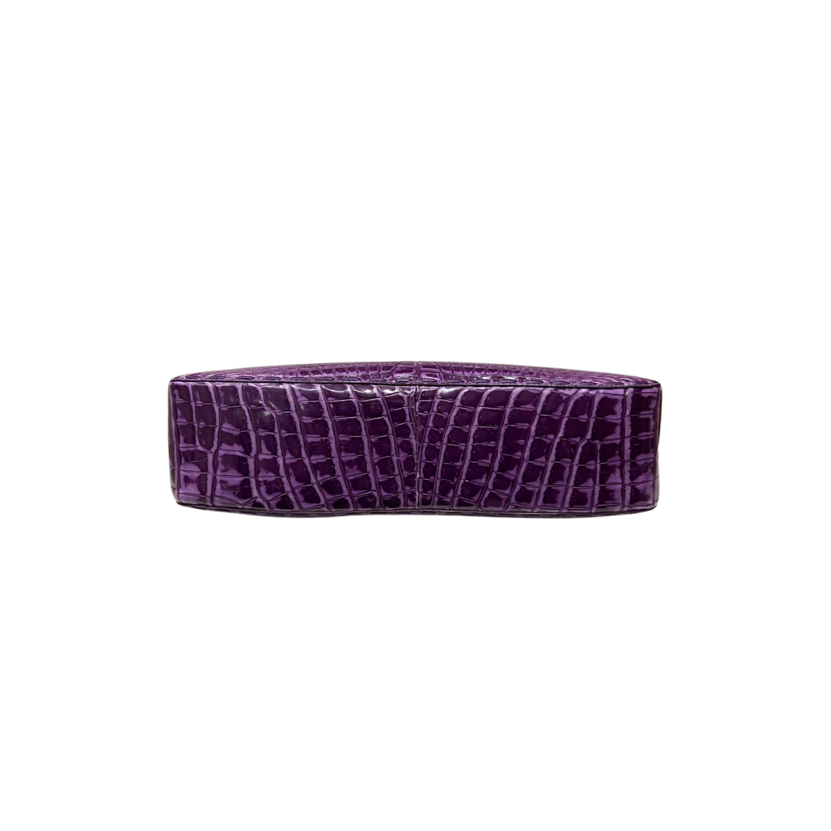 Detalhes: Modelo confeccionado em couro roxo com textura croco. Possui formato retangular e alça curta em corrente, que pode ser utilizada de mão ou no ombro. Fechamento por botões magnéticos.