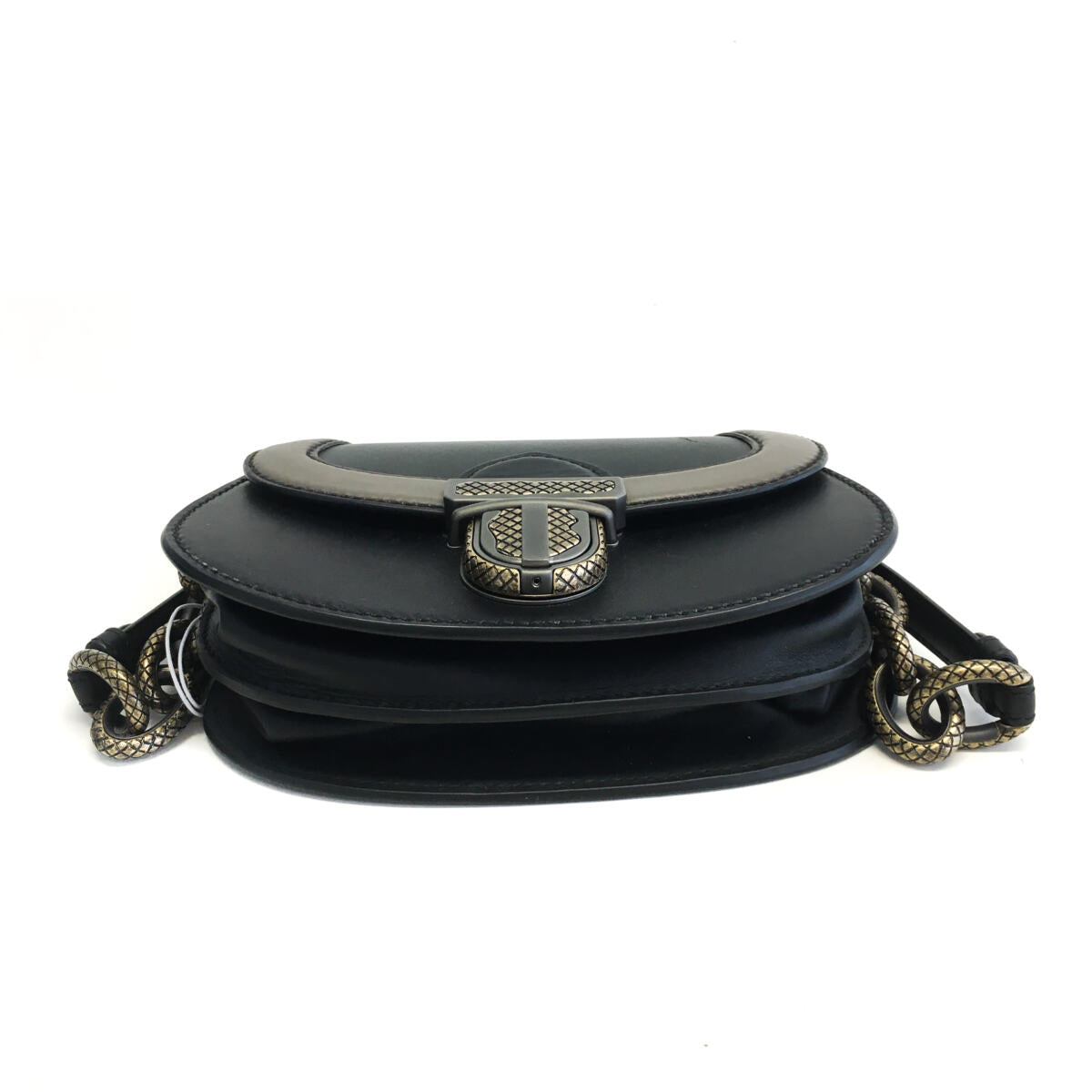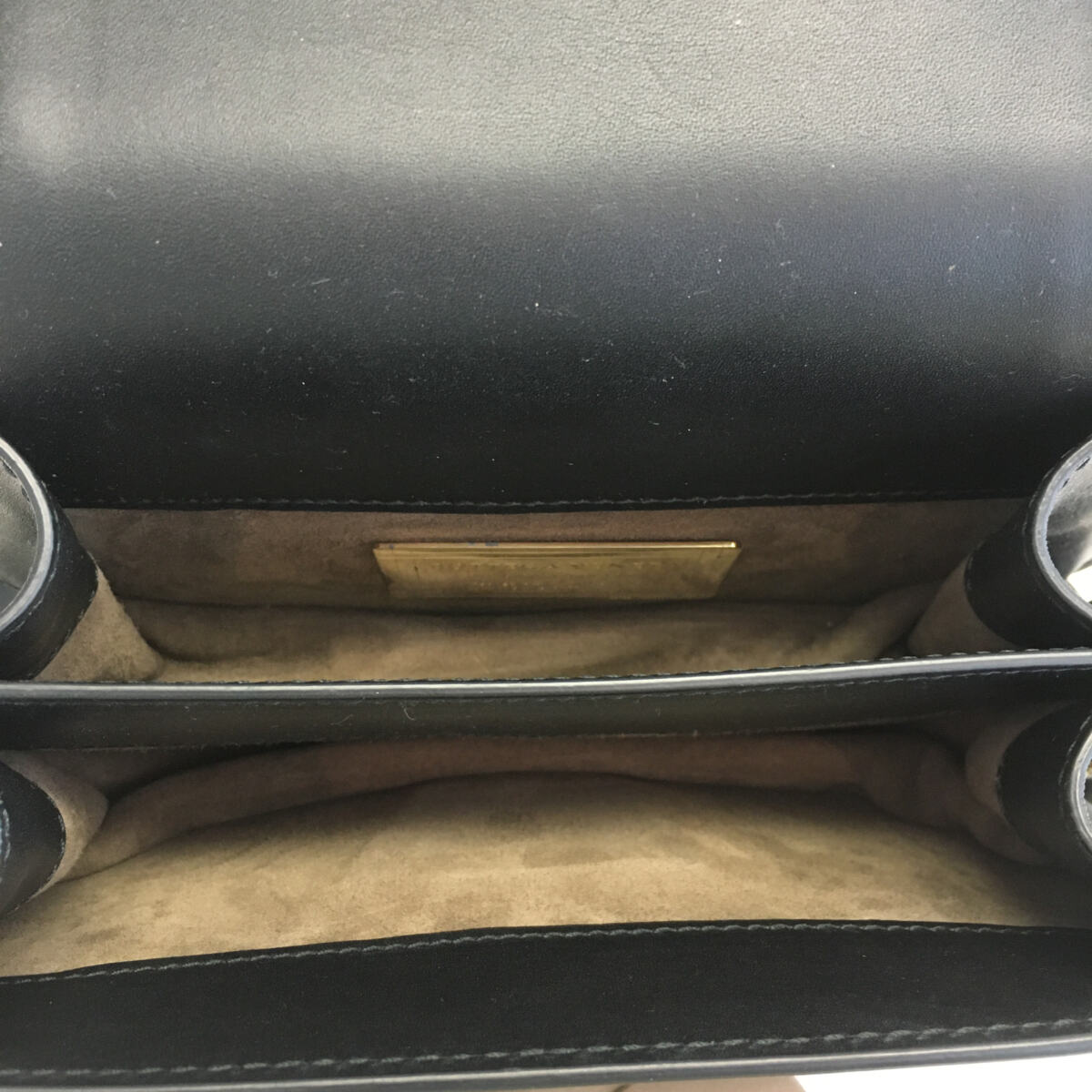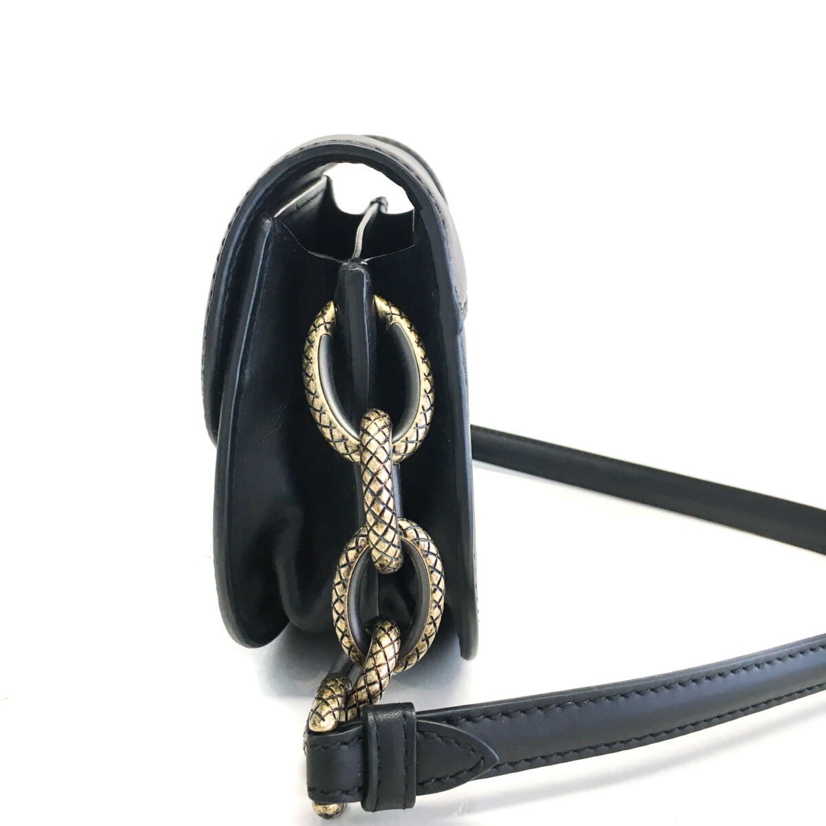 Detalhes: Bolsa Bottega Veneta The City Knot Preta Pequena. Modelo retangular pequeno, com couro preto e marrom liso, interior de camurça marrom da marca, com fecho de encaixe de chumbo e dourado e alça com couro e corrente.