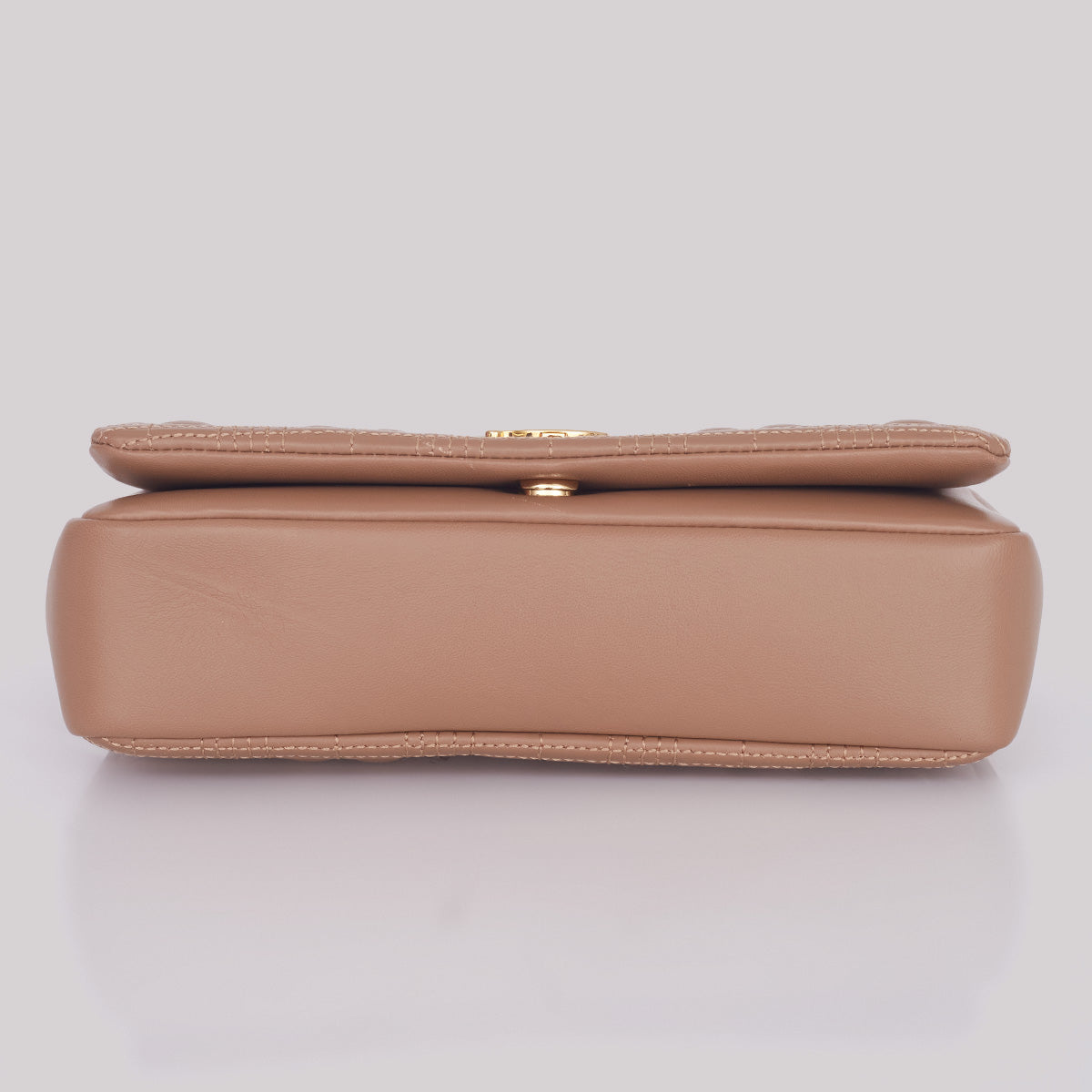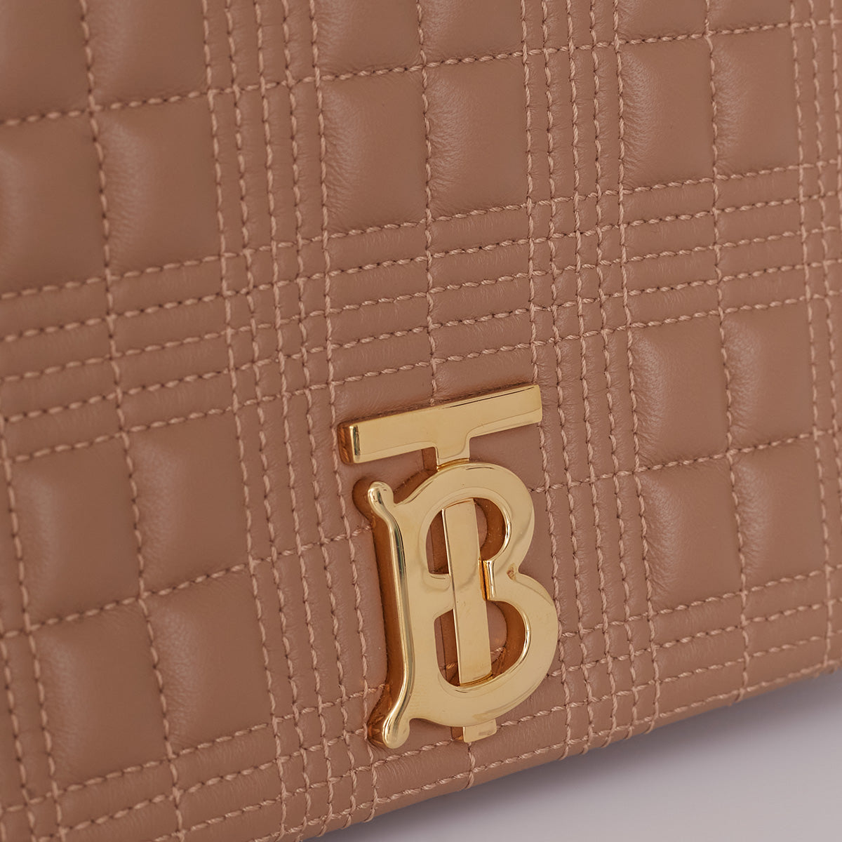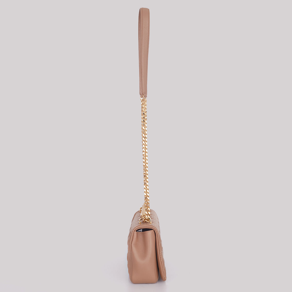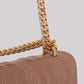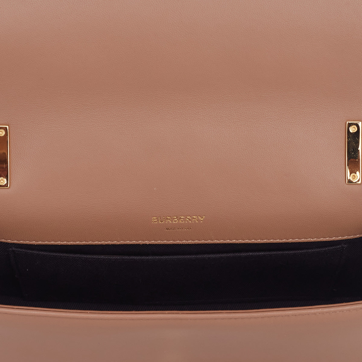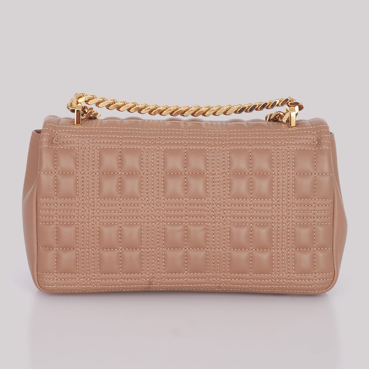 Detalhes: Bolsa Burberry confeccionada em couro nude e acabamento metalassê. Possui alça de ombro em corrente e detalhe da logo na frontal. Ferragem dourada. Fechamento por botão magnético.