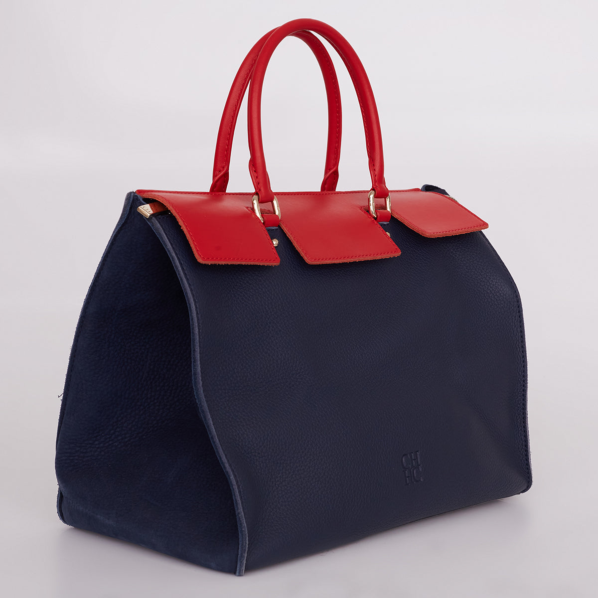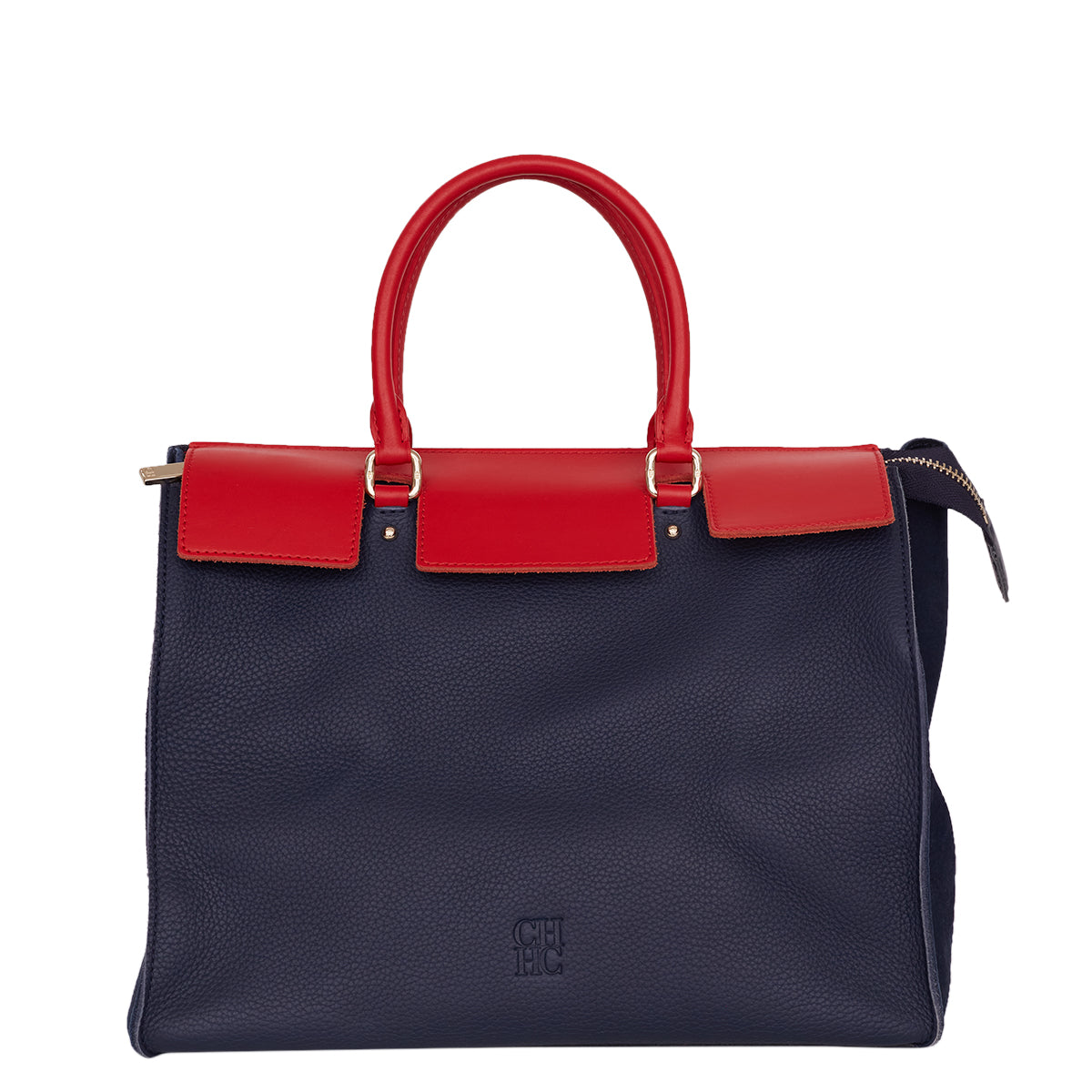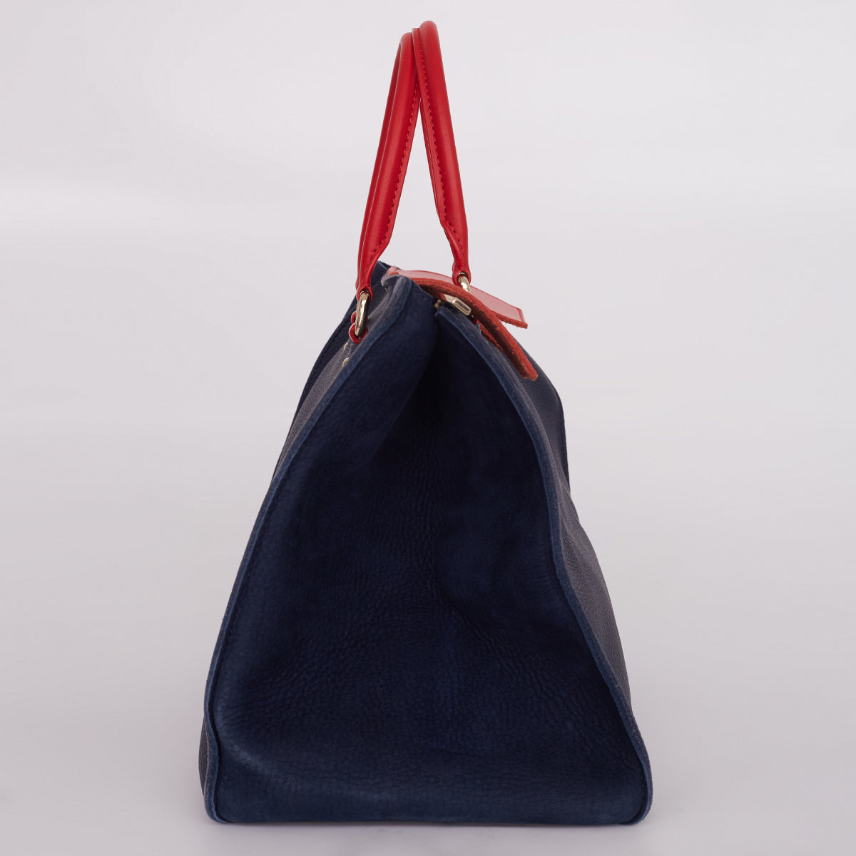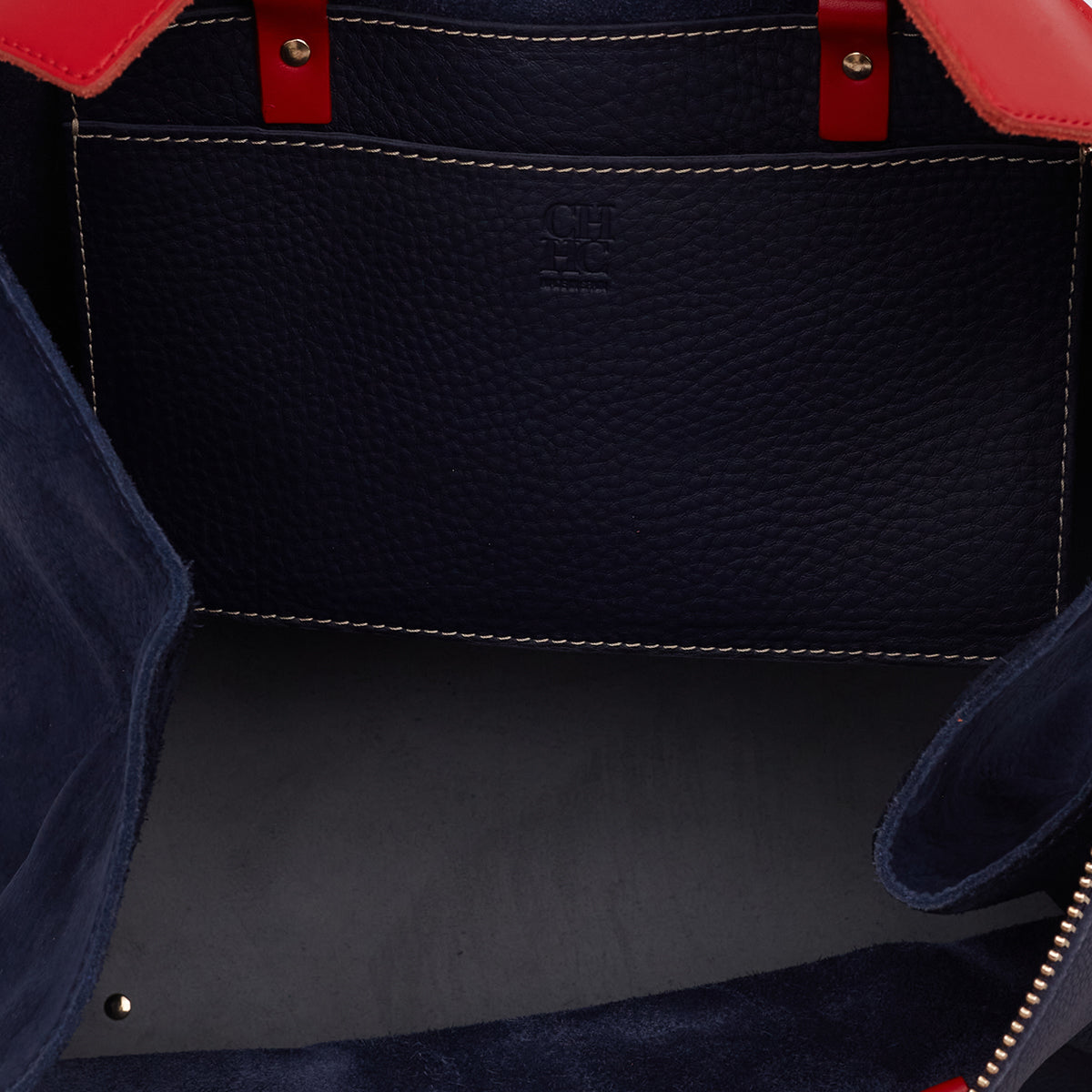 Detalhes: Bolsa Carolina Herrera confeccionada em couro na cor azul marinho com detalhes em vermelho. Possui alça de mão dupla em couro vermelho e ferragens em dourado. Laterais em camurça azul marinho. Parte interna em camurça e couro azul com um compartimento. Fechamento em ziper.