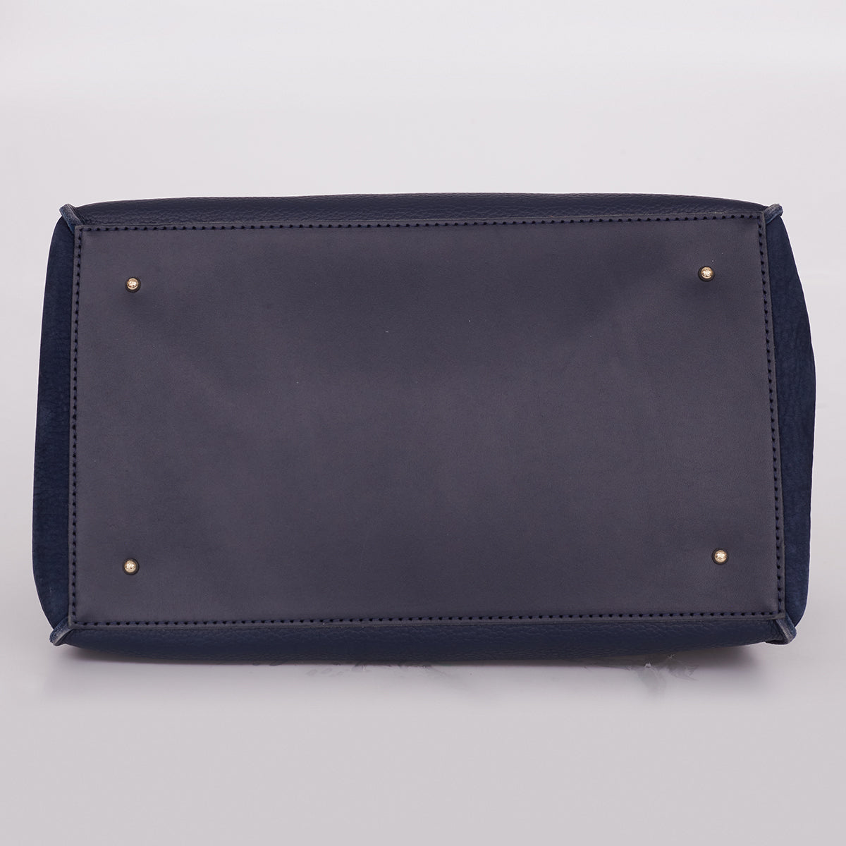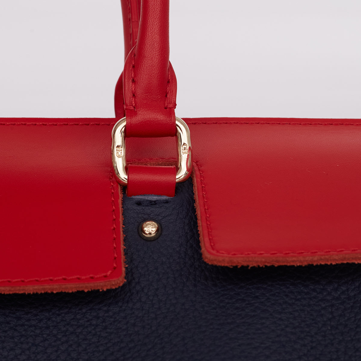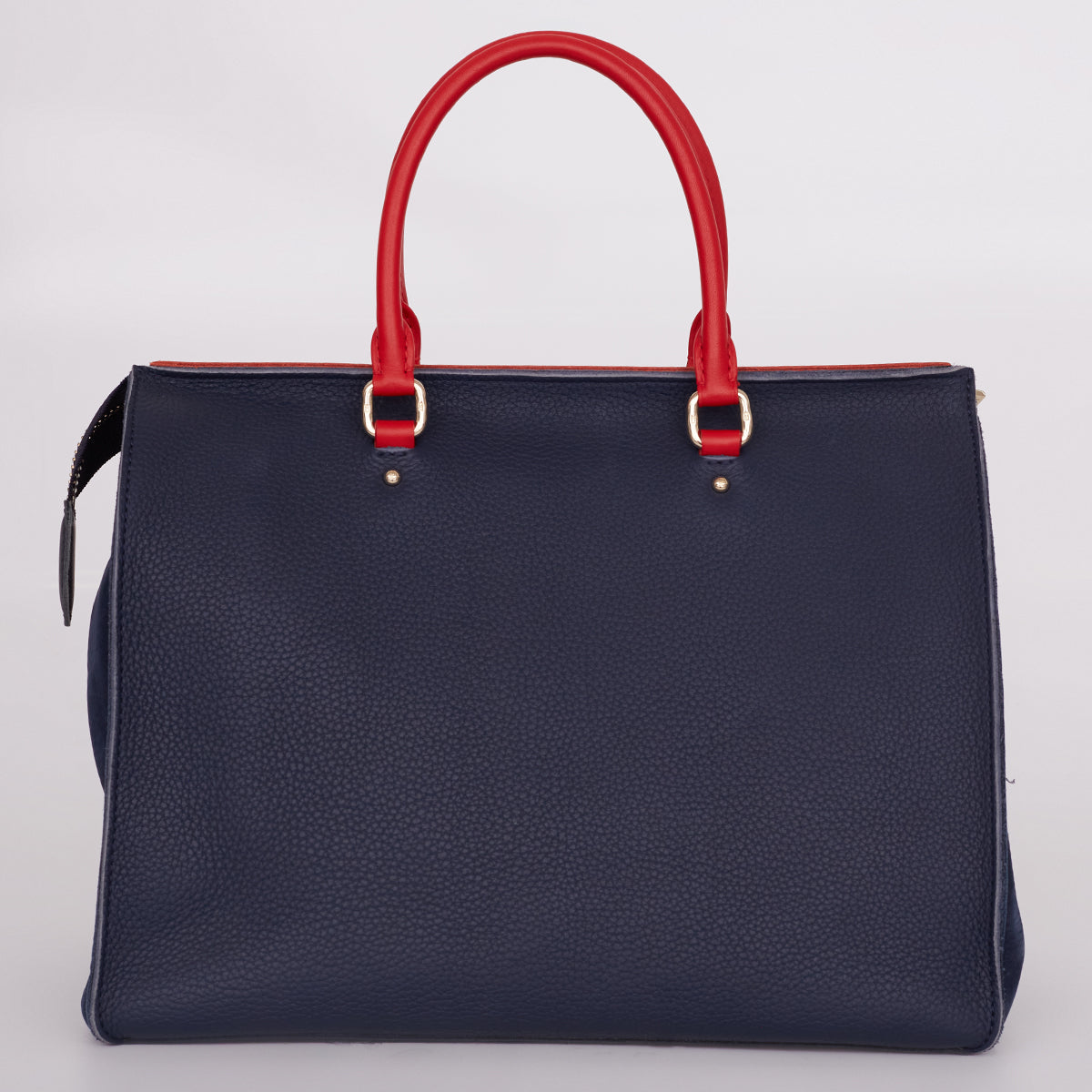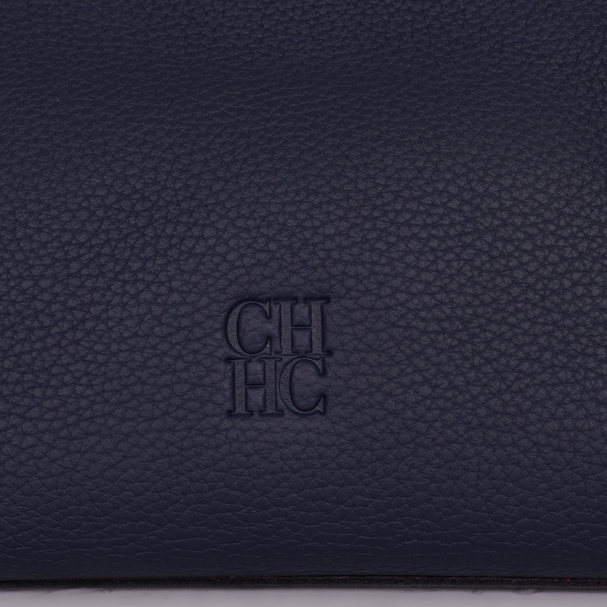 Detalhes: Bolsa Carolina Herrera confeccionada em couro na cor azul marinho com detalhes em vermelho. Possui alça de mão dupla em couro vermelho e ferragens em dourado. Laterais em camurça azul marinho. Parte interna em camurça e couro azul com um compartimento. Fechamento em ziper.