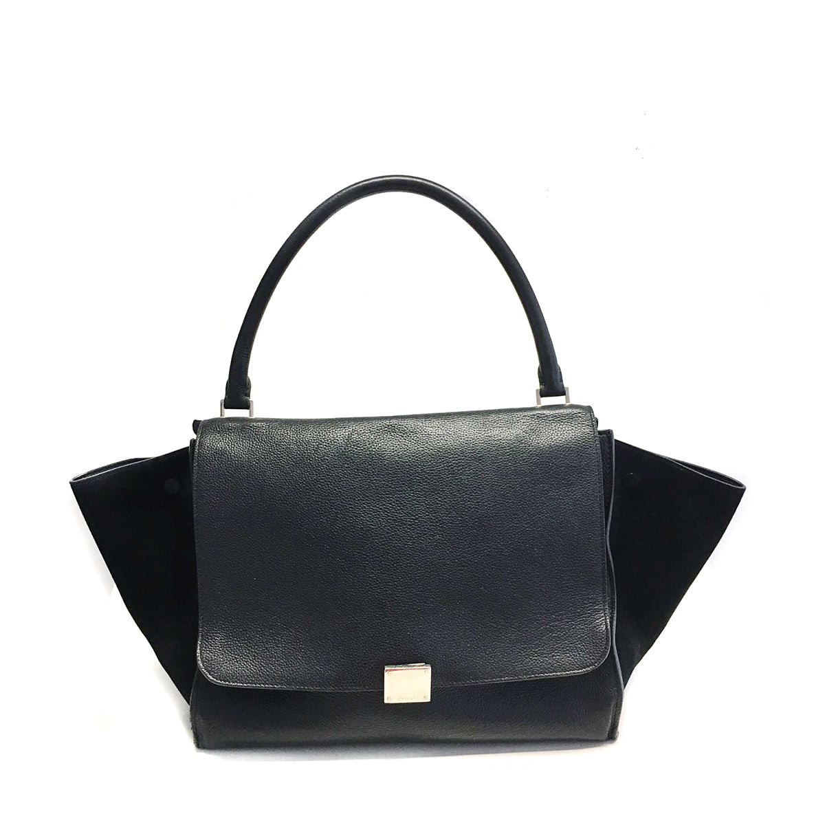 Detalhes: Bolsa Celine Trapézio . O modelo grande possui alça única de mão, e alça de ombro, com um bolso externo posterior com fecho por zíper, fecho principal por zíper, aba e dispositivo de encaixe giratório. Conta com amplo espaço interno, dois bolsos internos, botões de pressão nas laterais para ajuste de tamanho e ferragens prata.