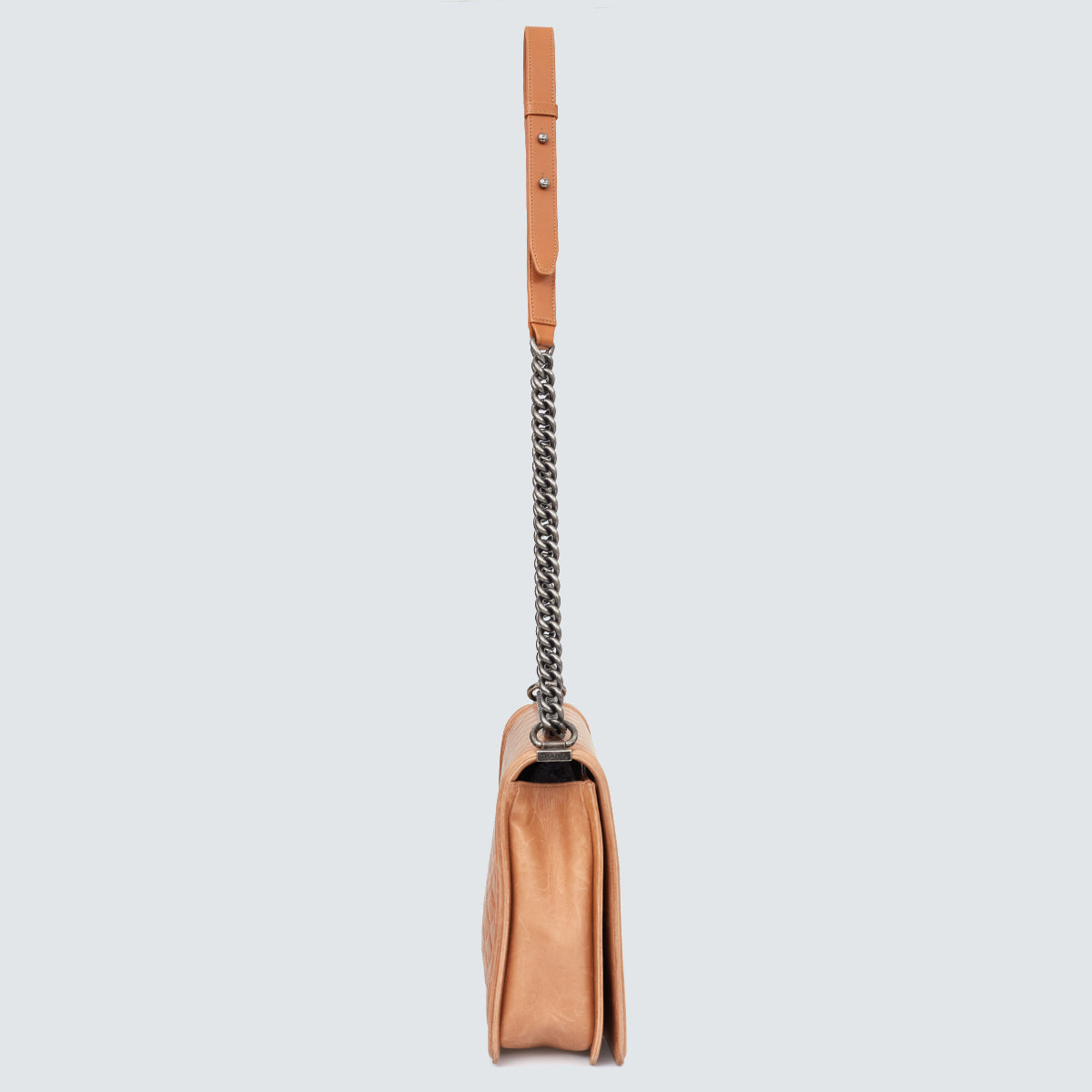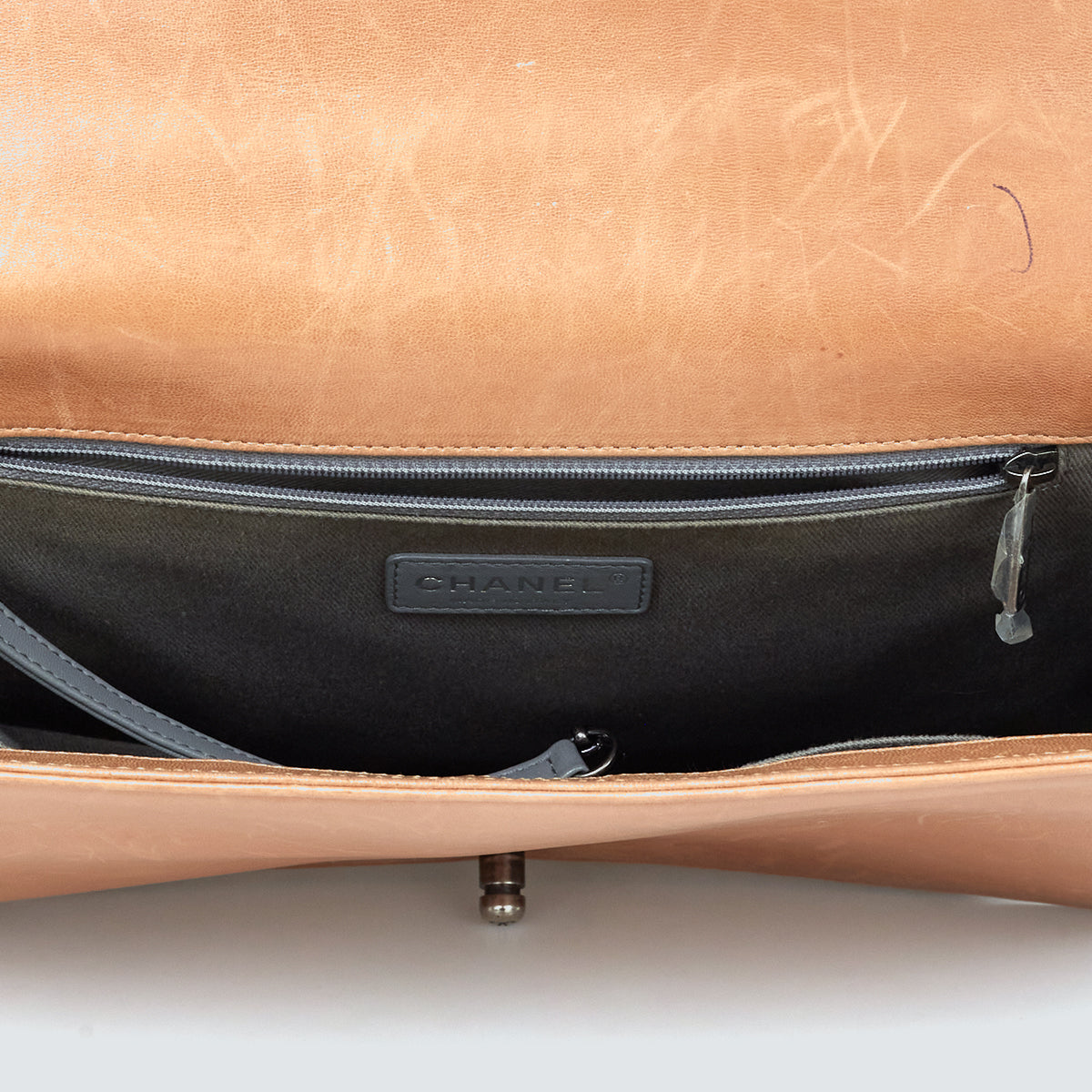 Detalhes: Bolsa Chanel Boy Large confeccionada em couro caviar com ferragens pratas. A bolsa conta com uma alça de corrente prata envelhecido e apoio de ombro em couro e o clássico fecho Boy CC no flap. O interior se abre para um forro em tecido, com dois bolsos simples e um com fecho por zíper.