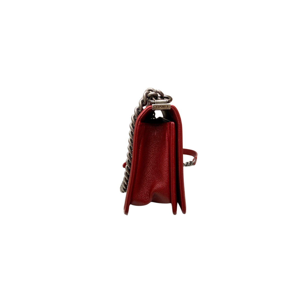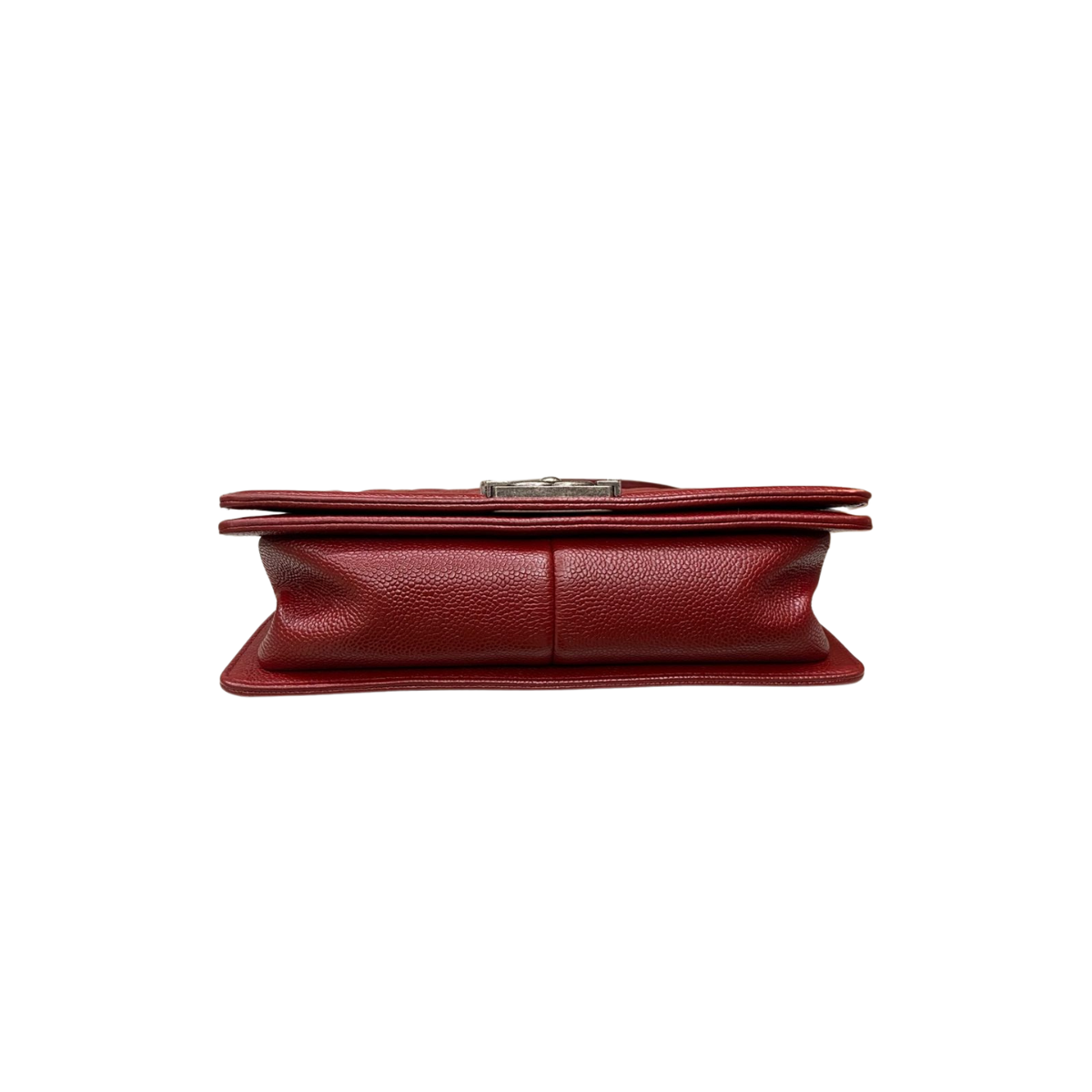 Detalhes: Bolsa Chanel Boy confeccionada em couro em vinho. Modelo possui formato retangular, ferragens prata, alça dupla de couro e corrente podendo ser usada no ombro e crossbody. Parte interna com bolso com zíper. Fecho em aba por dispositivo de encaixe com CC. *Acompanha dust da marca*