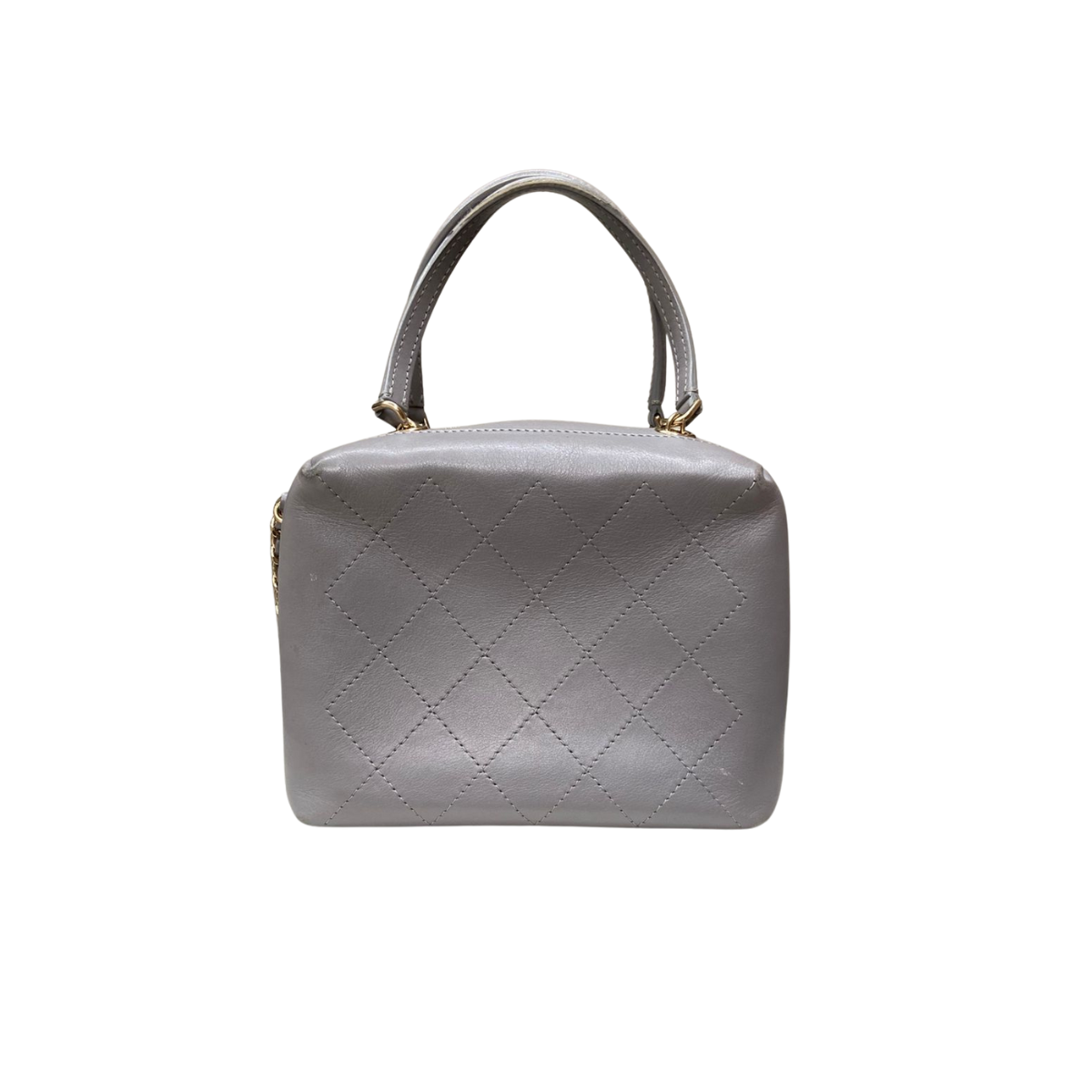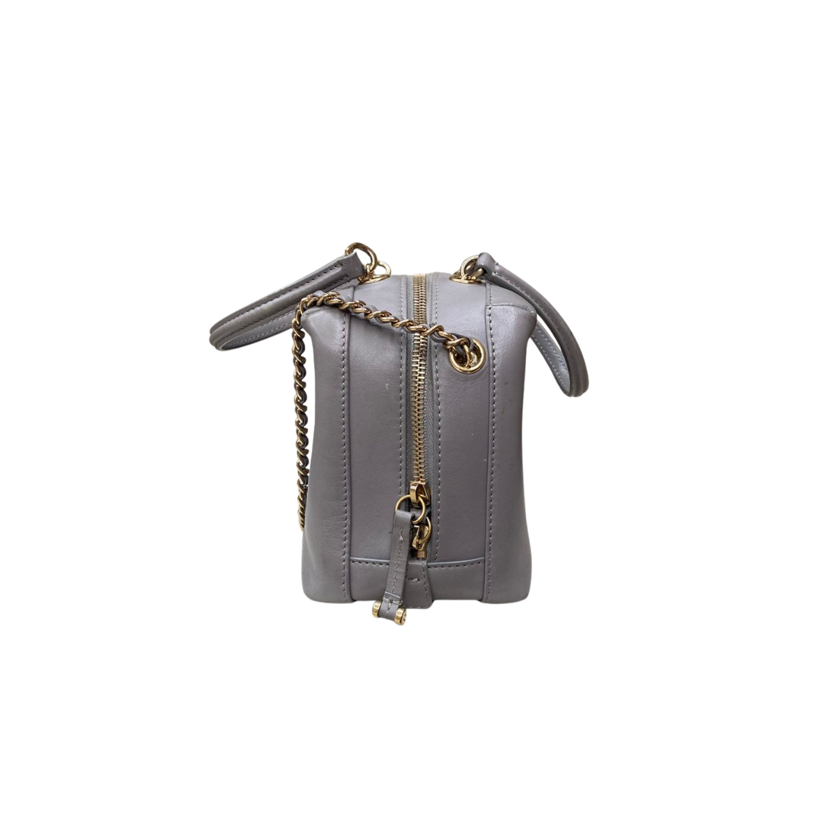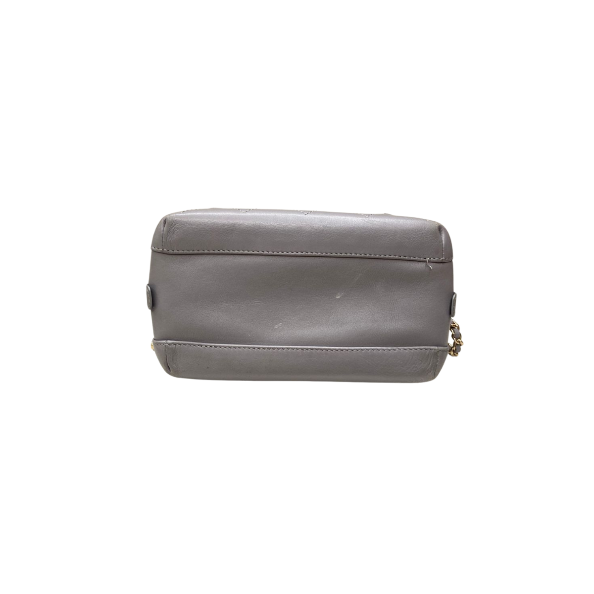 Detalhes: Bolsa Chanel confeccionada em couro na cor rosa cinza. Modelo conta com alça de mão dupla em couro, alça de ombro em corrente com couro e logo CC frontal. Parte interna em tecido cinza, conta com compartimento único e um bolso. Ferragens douradas. Fechamento em botão giratório. *Acompanha dustbag da marca*