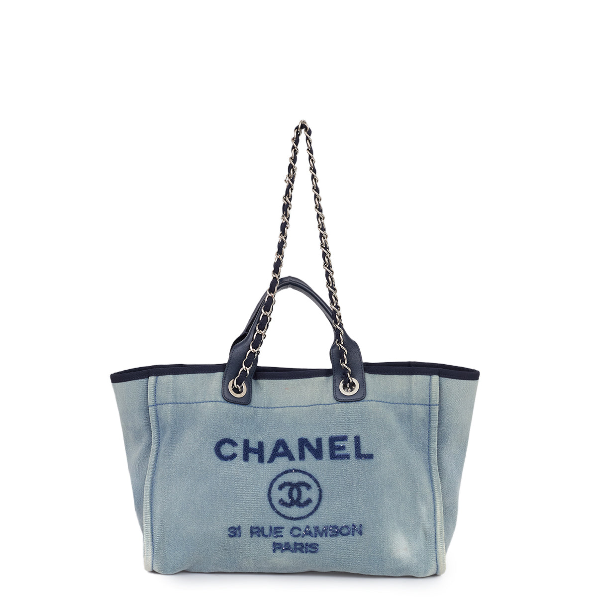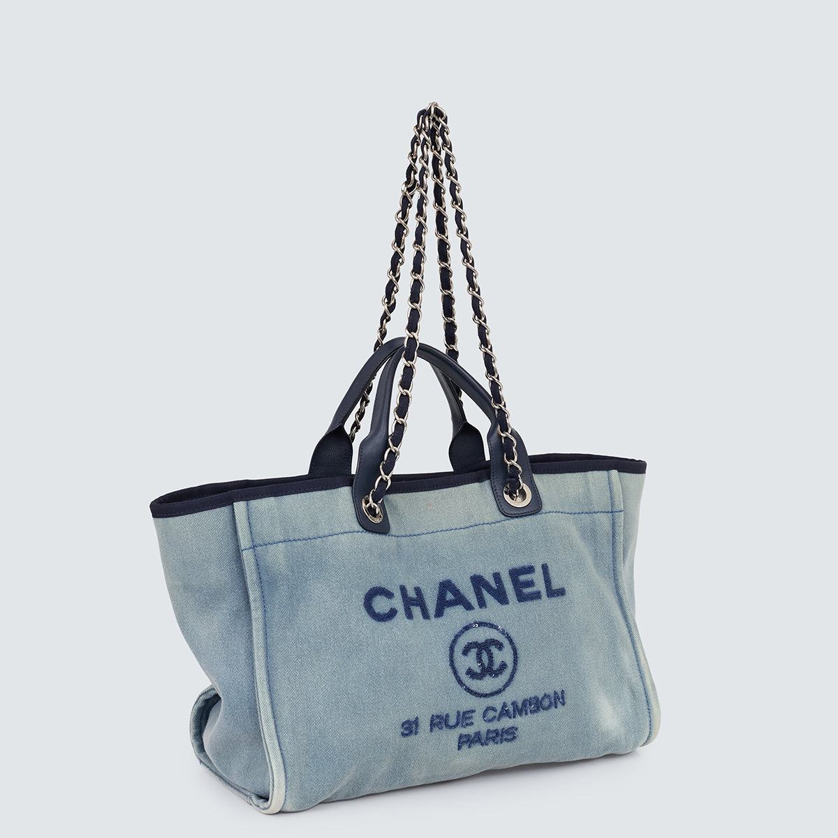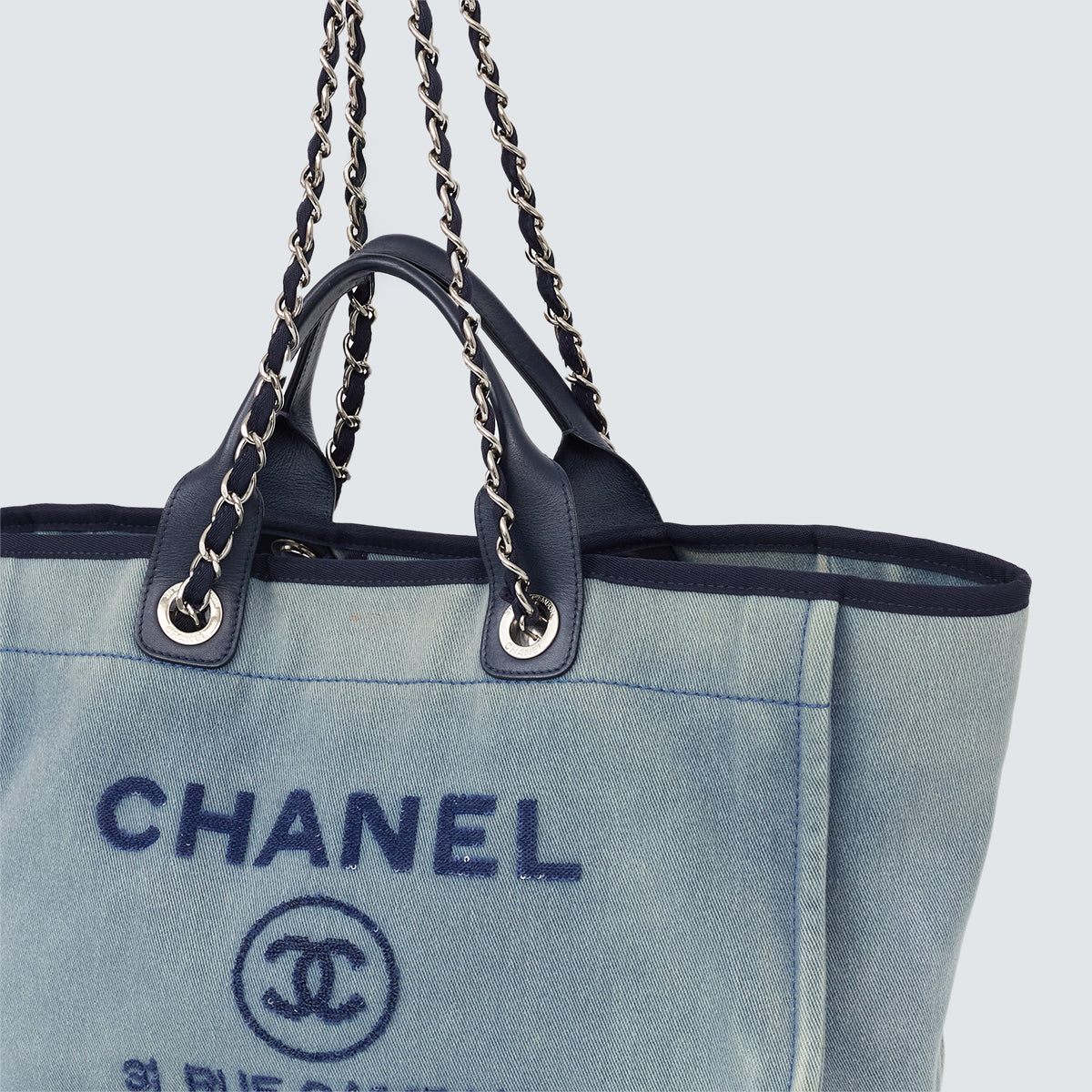 Detalhes: Bolsa Chanel Deauville confeccionada em jeans claro Modelo possui alça de mão em couro, alça de ombro em couro e corrente, logo e nome da marca bordado com lantejoulas azul marinho na parte frontal. Parte interna em tecido azul, contém compartimento único amplo, três bolsos e apenas um com zíper. Ferragens prateadas. Fechamento por botão magnético.