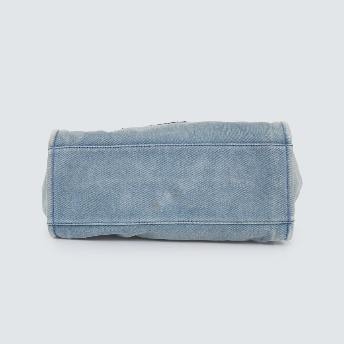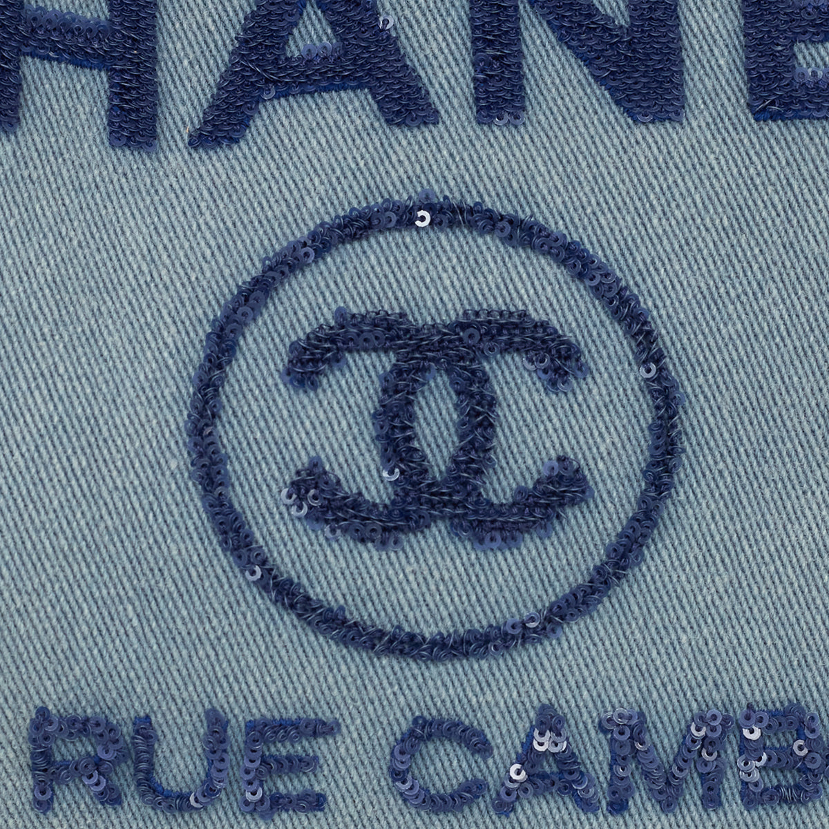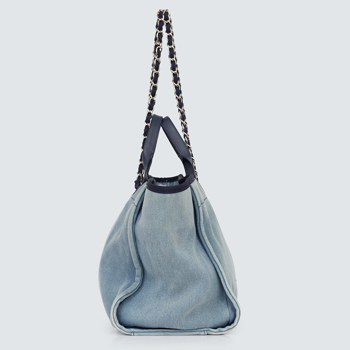Detalhes: Bolsa Chanel Deauville confeccionada em jeans claro Modelo possui alça de mão em couro, alça de ombro em couro e corrente, logo e nome da marca bordado com lantejoulas azul marinho na parte frontal. Parte interna em tecido azul, contém compartimento único amplo, três bolsos e apenas um com zíper. Ferragens prateadas. Fechamento por botão magnético.