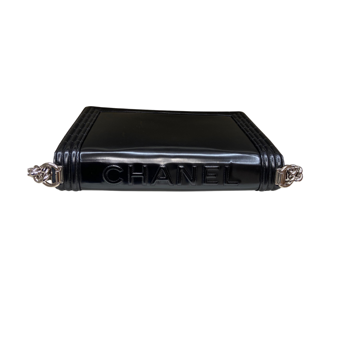 Detalhes: Esta elegante bolsa tiracolo é confeccionada em couro envernizado preto, com uma borda em matelassê linear também em azul. A bolsa conta com uma alça de corrente prata envelhecido e alça de ombro em couro preto e o clássico fecho Boy CC no flap. O interior se abre para um forro em tecido cinza, com bolsos com zíper e bolsos aplicados.