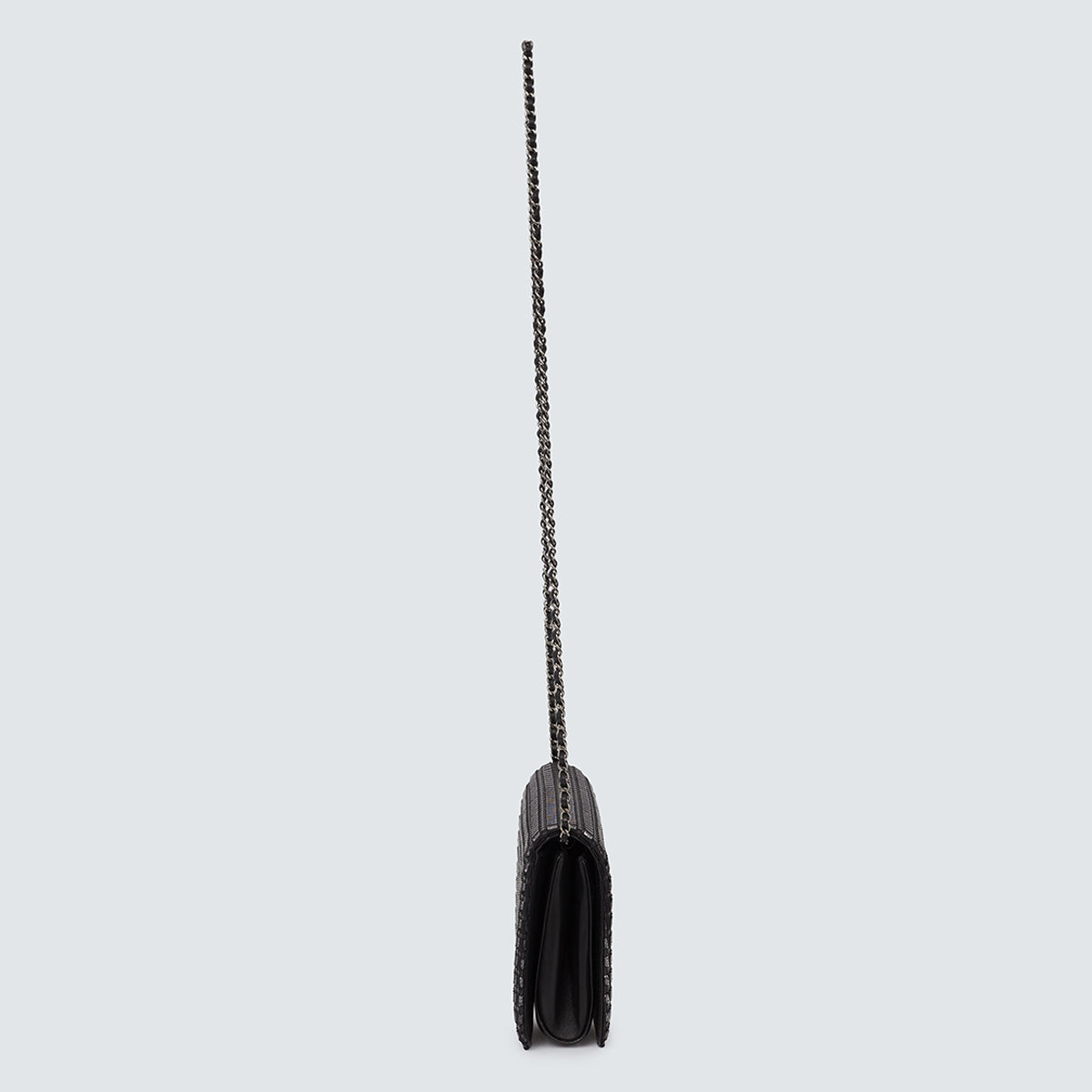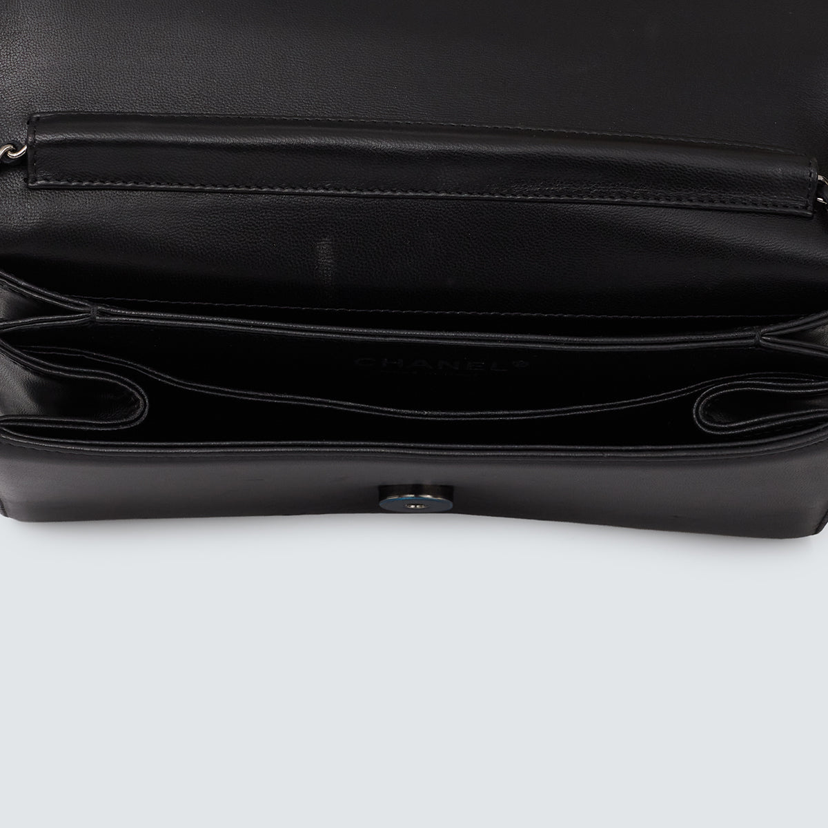 Detalhes: Bolsa Chanel confeccionada em couro na cor preta. O modelo possui correntes prateadas e parte interna com bolso. Fechamento principal por botão magnético.