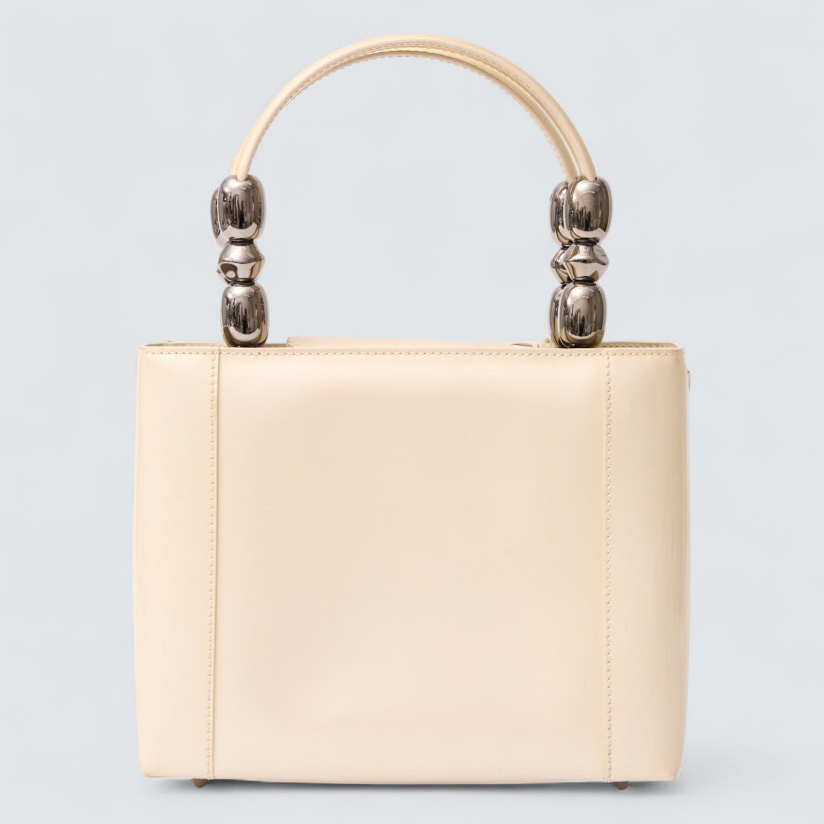 Detalhe: Modelo confeccionado em couro na cor branco. Possui duas alças de mão em couro, com detalhes metálicos prateados em formato de contas. Possui um pequeno pingente de couro circular pendurado em uma das alças. Contém parte interna em tecido, com um bolso com zíper. Fechamento principal por botão magnético.