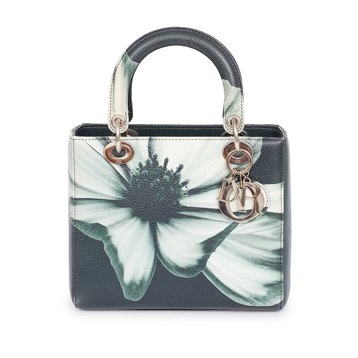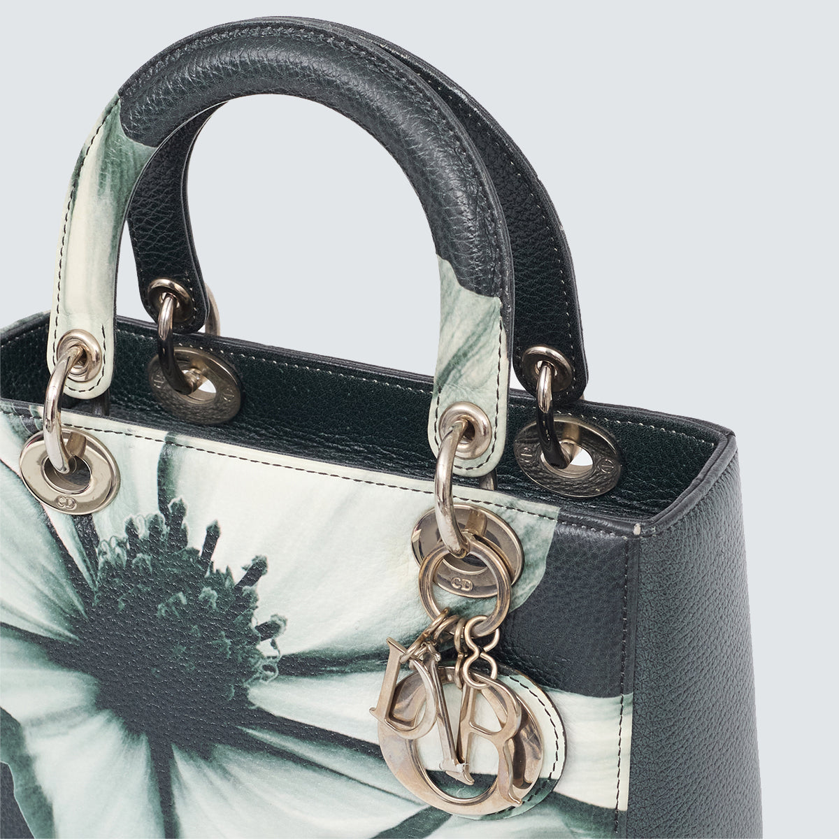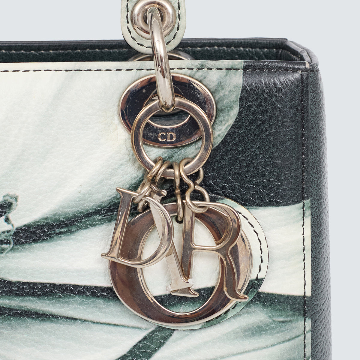 Detalhes: Bolsa Christian Dior Lady Dior confeccionada em couro com estampa de flor nas cores branco e tons de verde. Possui formato quadrado, alça de mão dupla fixa e alça de ombro exposta por mosquetão e pingente frontal com nome Dior. Parte interna em couro na cor preta e conta com um bolso com fecho por zíper. Ferragens prateadas. Feito por zíper.