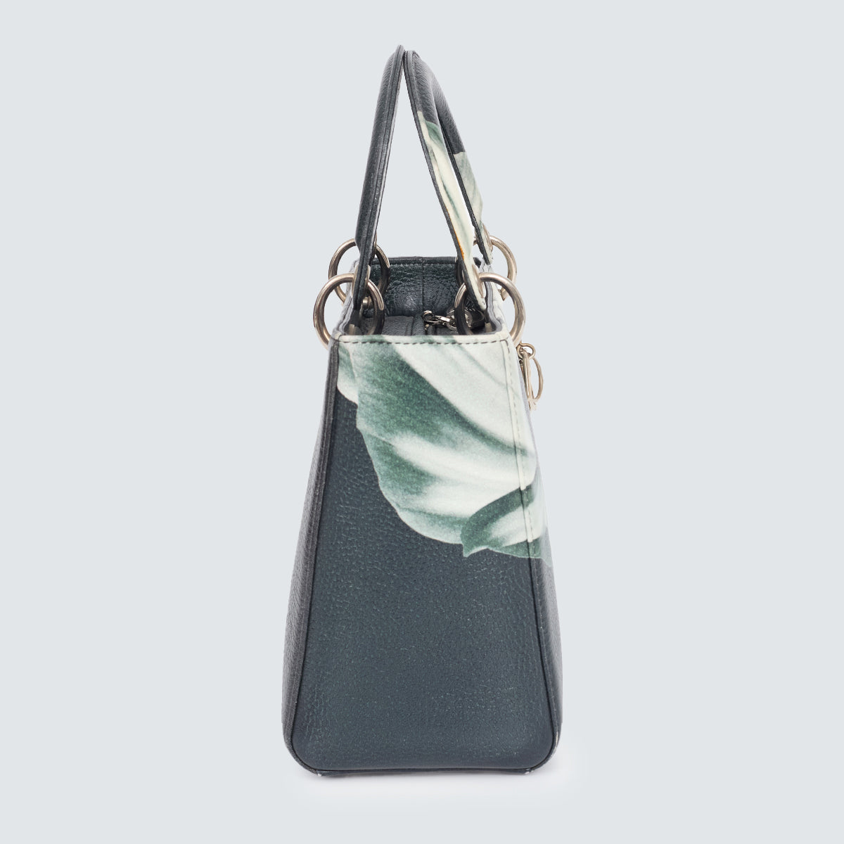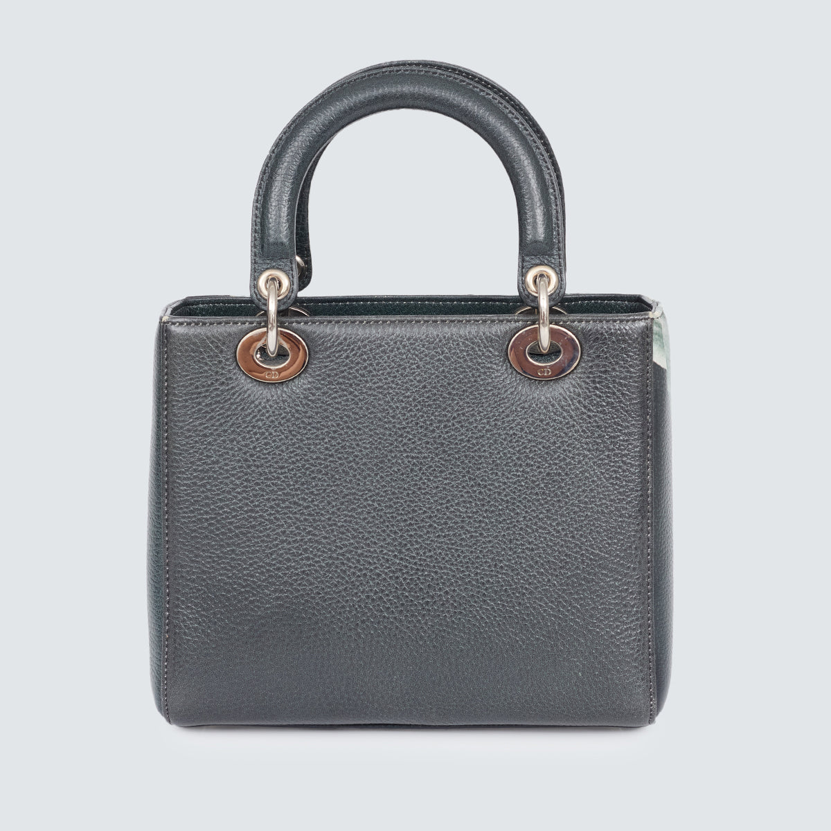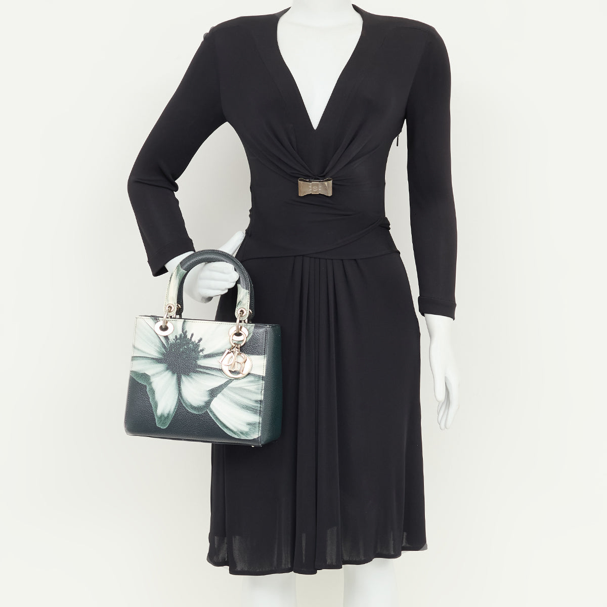 Detalhes: Bolsa Christian Dior Lady Dior confeccionada em couro com estampa de flor nas cores branco e tons de verde. Possui formato quadrado, alça de mão dupla fixa e alça de ombro exposta por mosquetão e pingente frontal com nome Dior. Parte interna em couro na cor preta e conta com um bolso com fecho por zíper. Ferragens prateadas. Feito por zíper.
