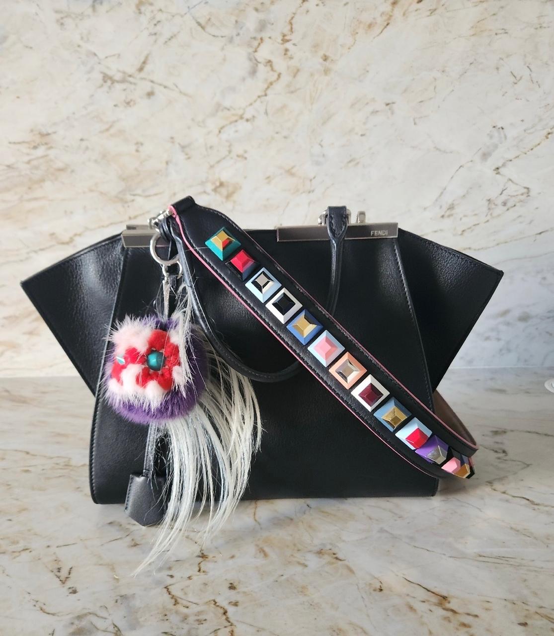 Detalhes: Bolsa Fendi confeccionada em couro na cor preta. Modelo possui alça de mão em couro fixa, alça de ombro com detalhes em studs colorida, chaveiro removível, tags ,ferragens prateadas. Parte interna conta com compartimento único e dois bolsos.