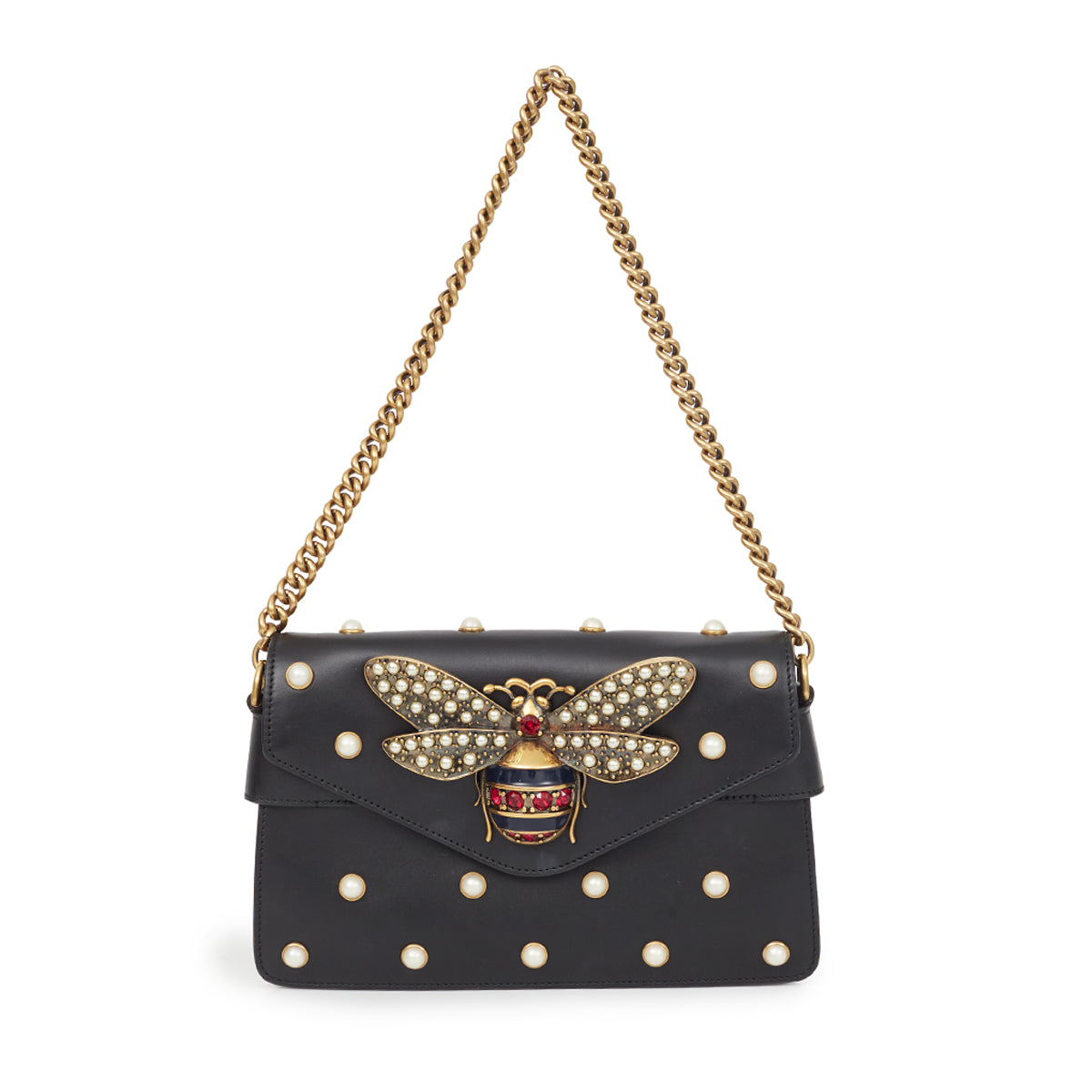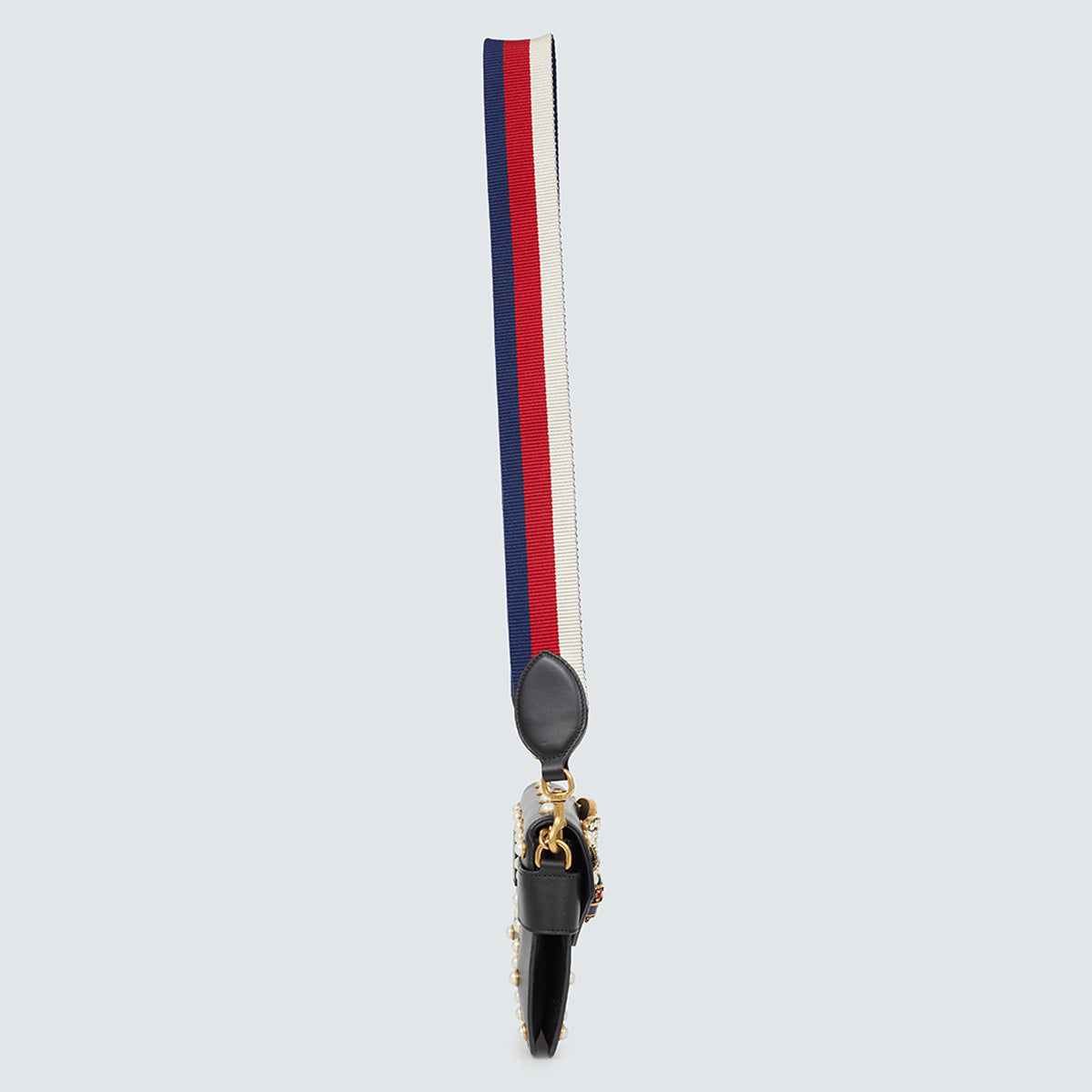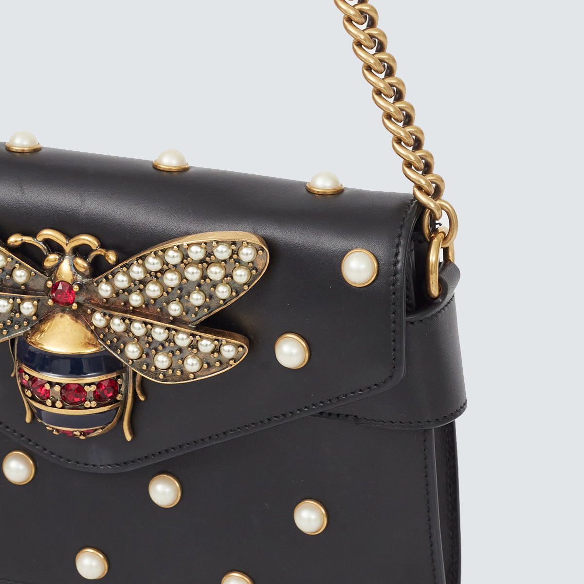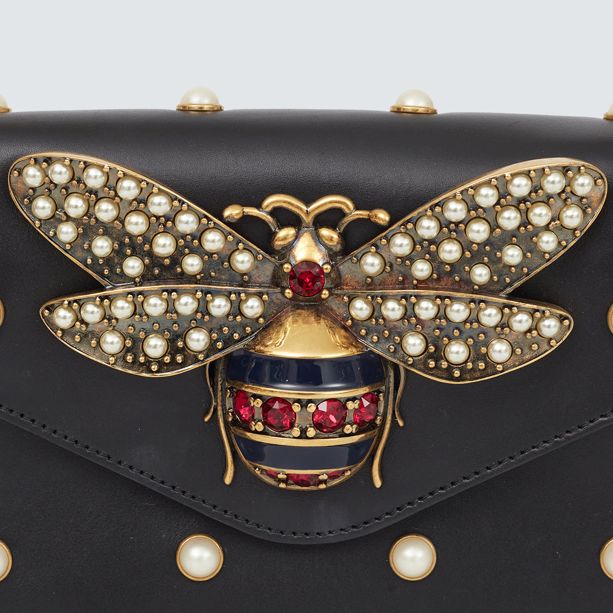 Detalhes: Bolsa Gucci Mini Broadway Pearly Be em couro na cor preta. O modelo possuo formato retangular, com aplicações de pérolas e abelha. Possui um bolso interno, alça de mão, alça de ombro em tecido nas cores branco, vermelho e azul presa por mosquetão. O fecho da peça é em botão magnético. *Acompanha caixa da marca*
