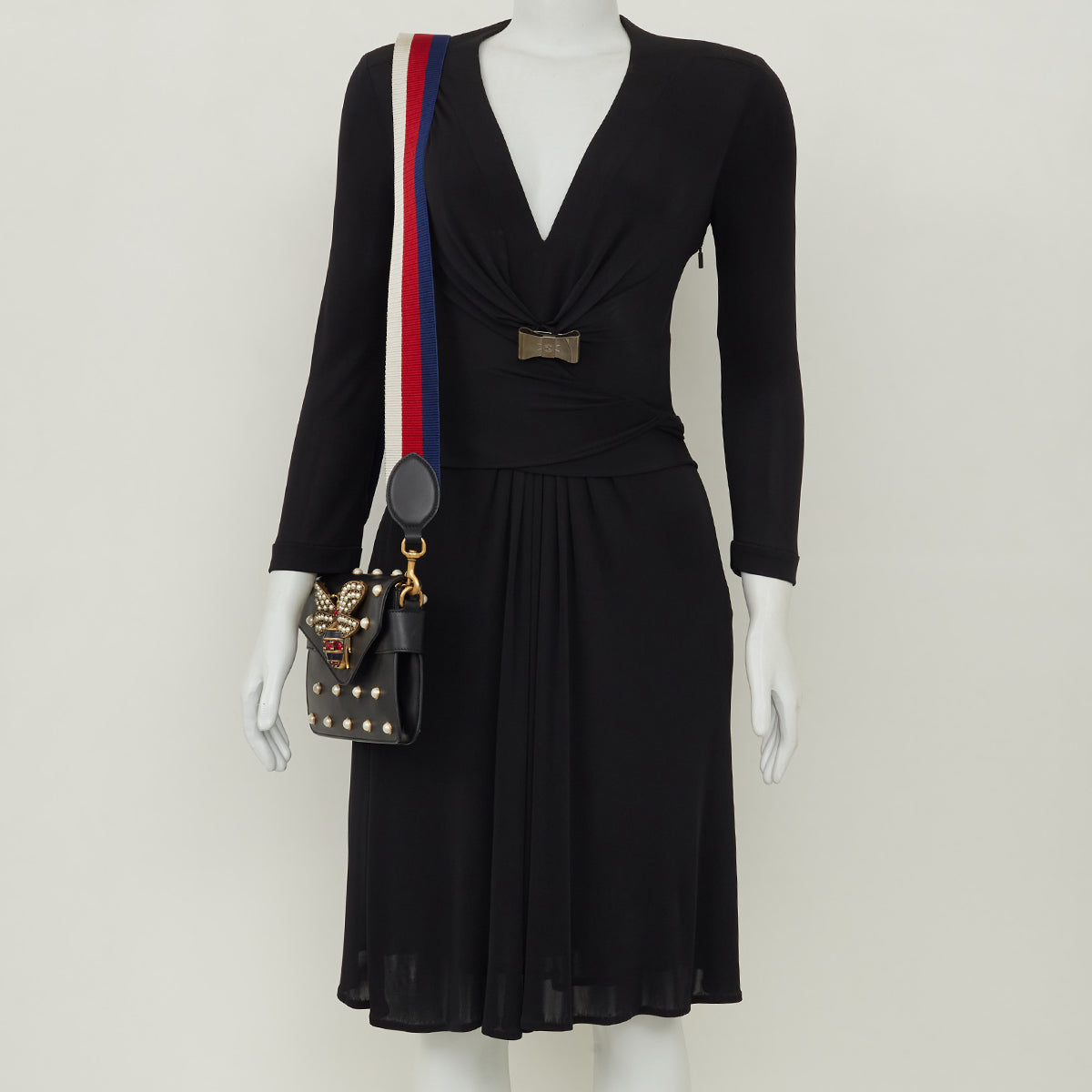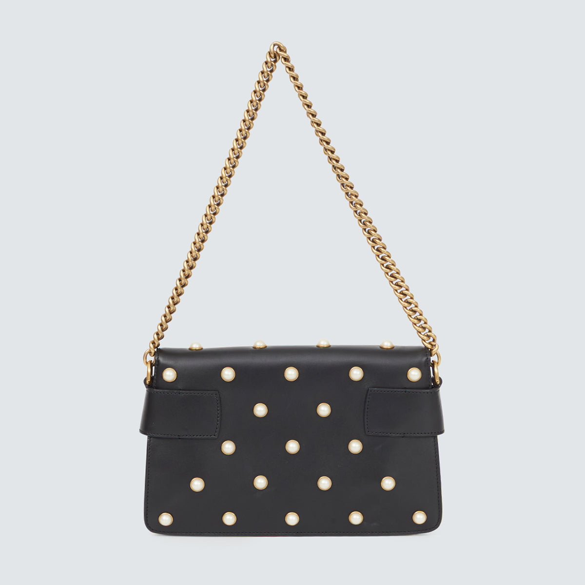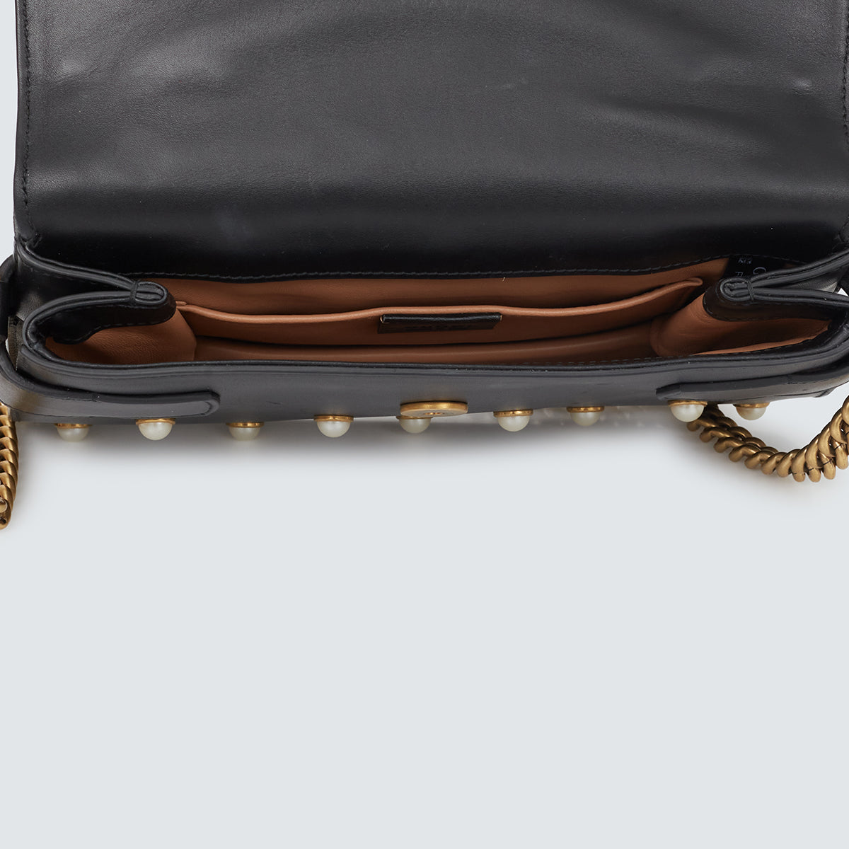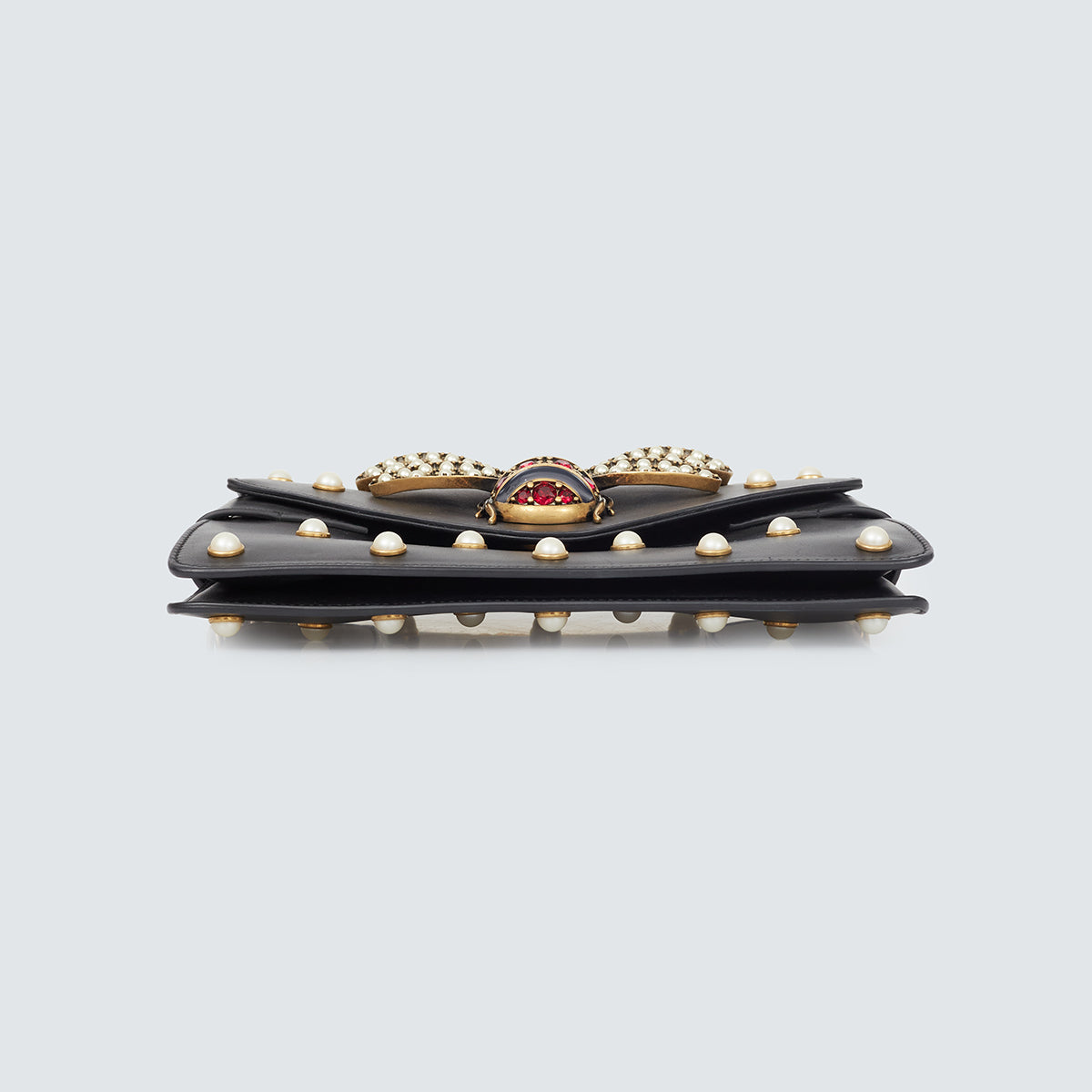 Detalhes: Bolsa Gucci Mini Broadway Pearly Be em couro na cor preta. O modelo possuo formato retangular, com aplicações de pérolas e abelha. Possui um bolso interno, alça de mão, alça de ombro em tecido nas cores branco, vermelho e azul presa por mosquetão. O fecho da peça é em botão magnético. *Acompanha caixa da marca*