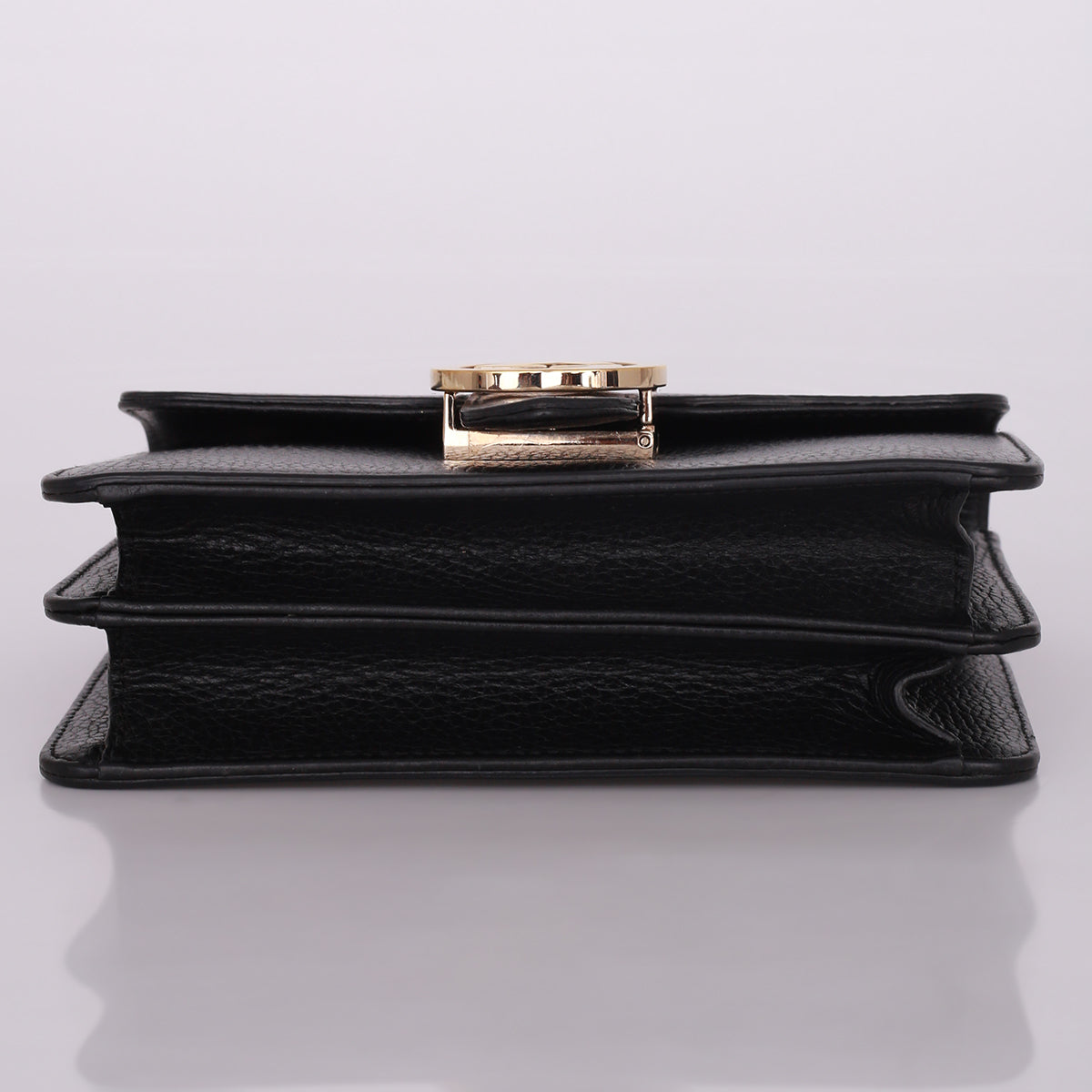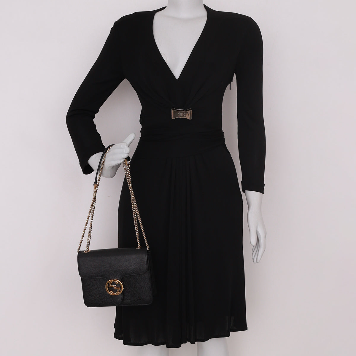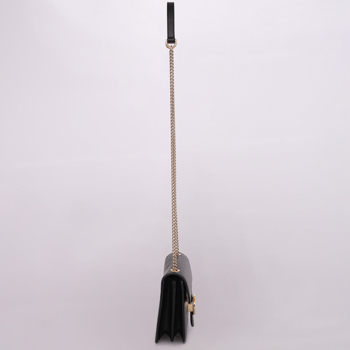 Detalhes: Bolsa Gucci Interlocking G Dollar confeccionado em couro na cor preto. Modelo possui alça longa em couro e corrente, GG frontal e ferragens douradas. Parte interna em linho, conta com duas divisórias e um bolso. Fechamento por botão de encaixe. Acompanha dustbag