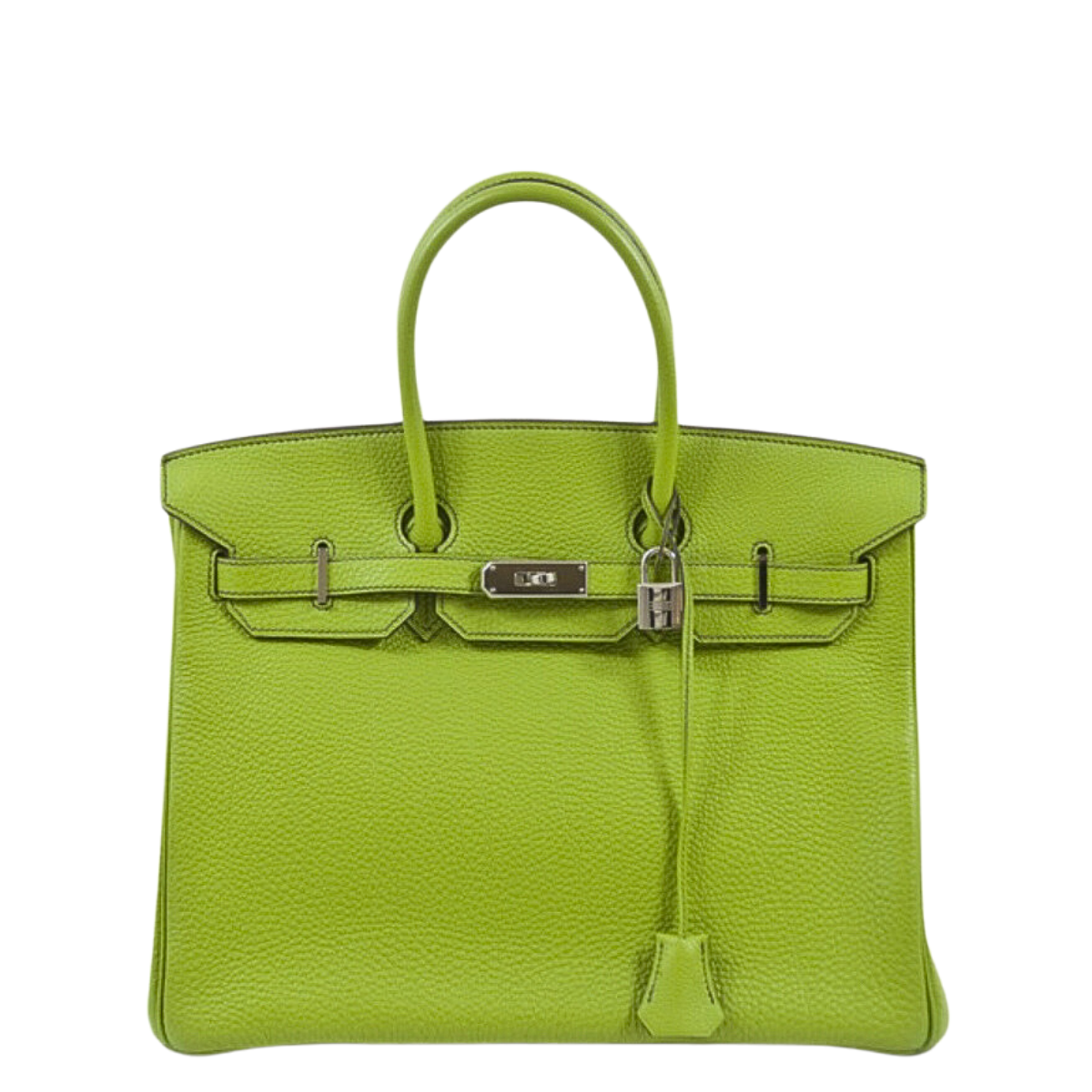 Detalhes: Bolsa Hèrmes Birkin 35 confeccionada em couro na cor verde lima. Possui alça de mão dupla e fixa, ferragens prateadas e tag e cadeado na parte frontal. Parte interna em couro verde musgo, conta com amplo espaço, dois bolsos e apenas um com fecho em zíper. Fecho por aba com botão de encaixe giratório.