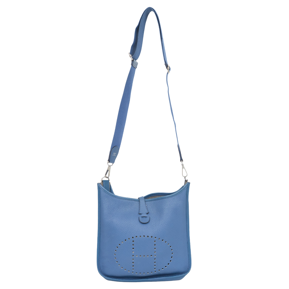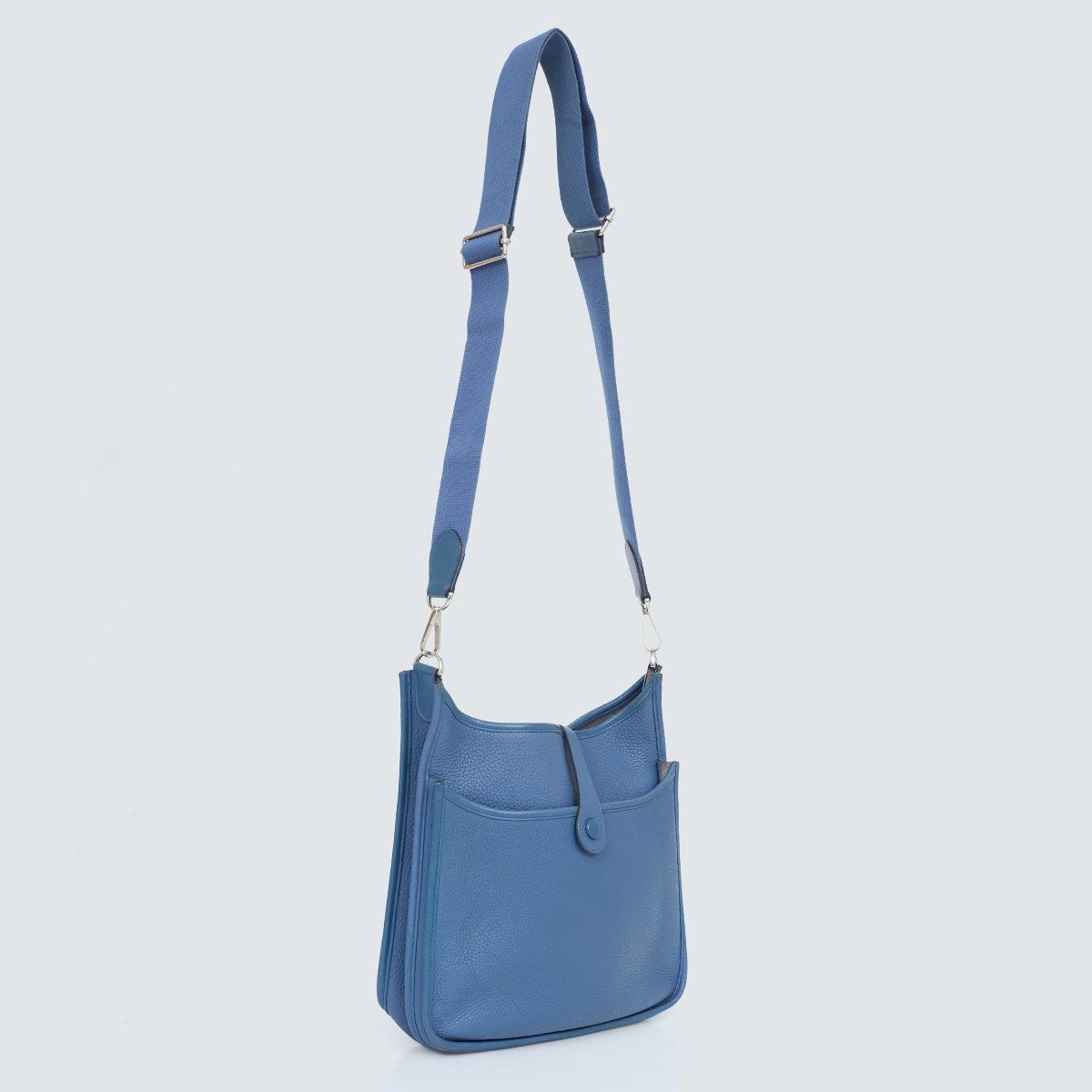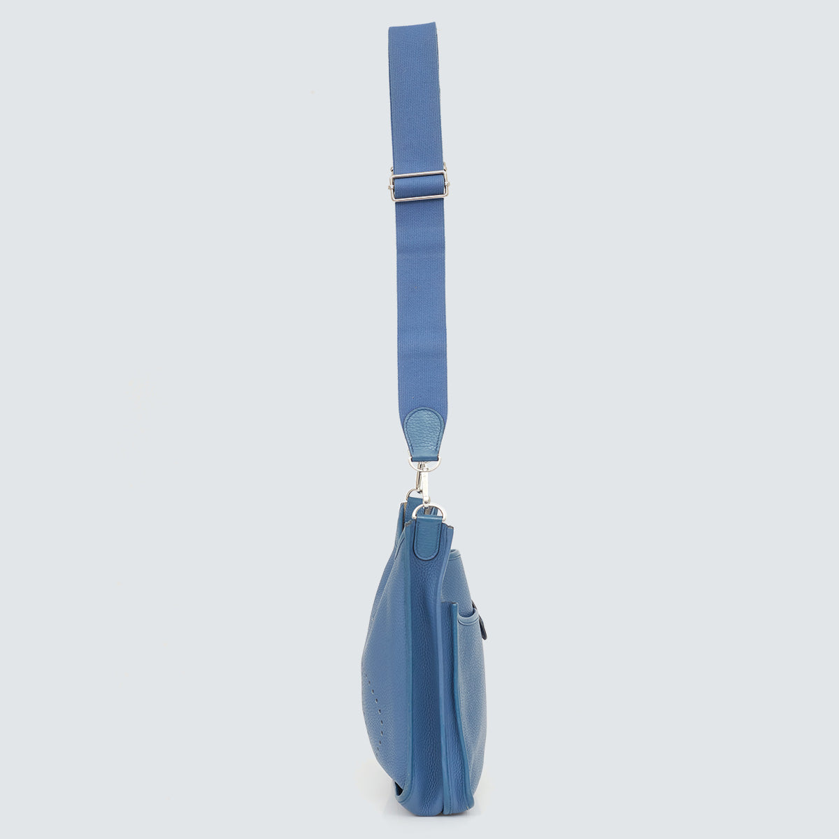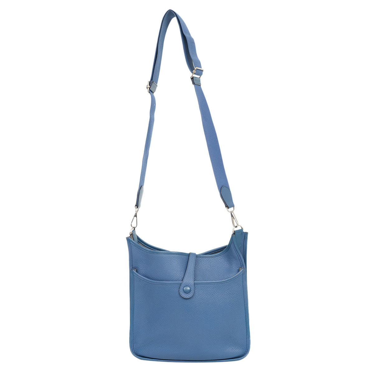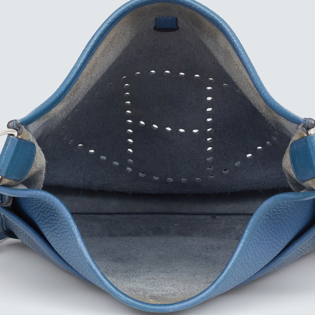Detalhes: Bolsa Hermes Evelyne confeccionada em couro na cor azul. Modelo possui alça de ombro removível e ajustável, logo vazado na parte frontal e bolso posterior. Parte interna com compartimento único em camurça. Ferragens prateadas. Fechamento por botão de pressão.