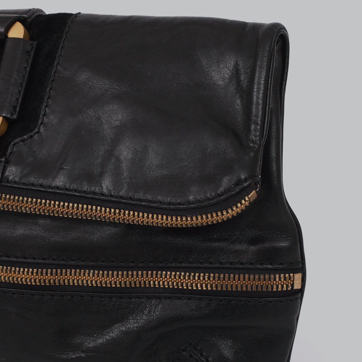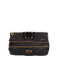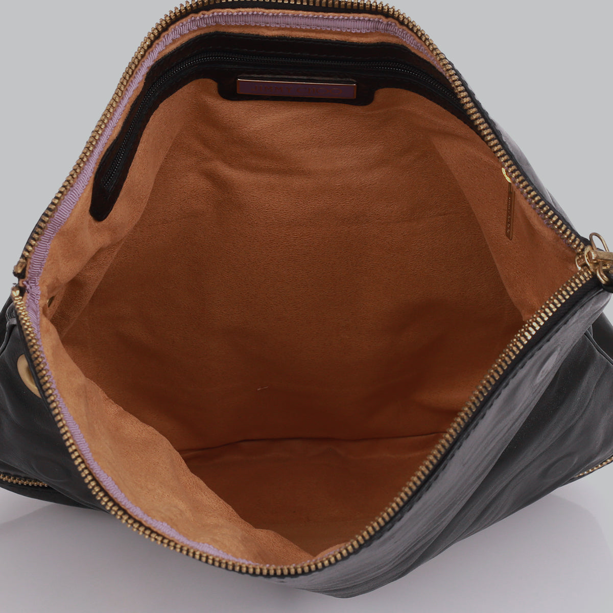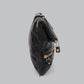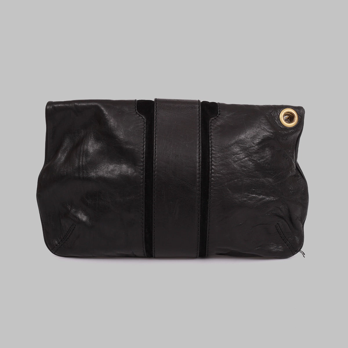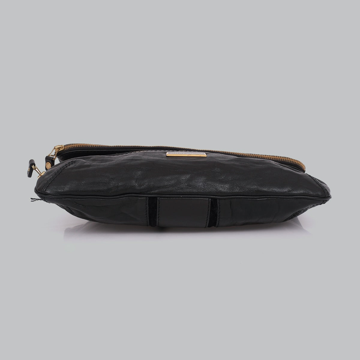 Detalhes: Clutch Miu Miu confeccionada em couro na cor preta. O modelo possui formato retangular com detalhe de ferragens douradas na parte frontal. Compartimento interno único em camurça bege, contém dois bolsos, um bolso com fechamento em zíper. Fechamento principal por dois botões magnéticos na parte frontal e zíper. Apresenta bolso na parte da frente, ilhós e detalhe em camurça preto. *Acompanha dustbag da marca*