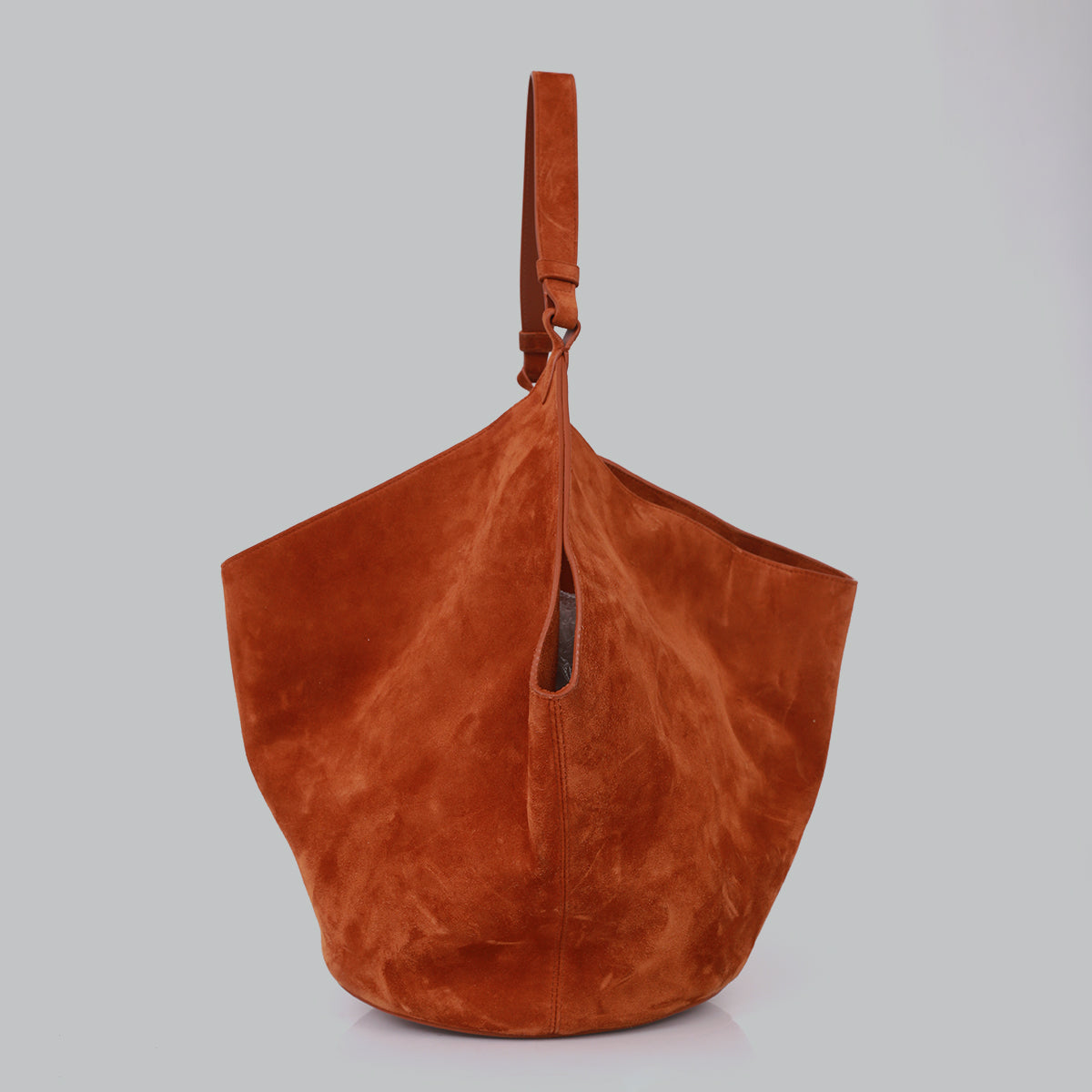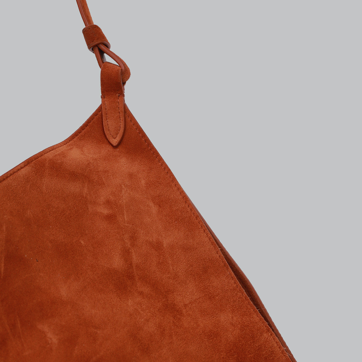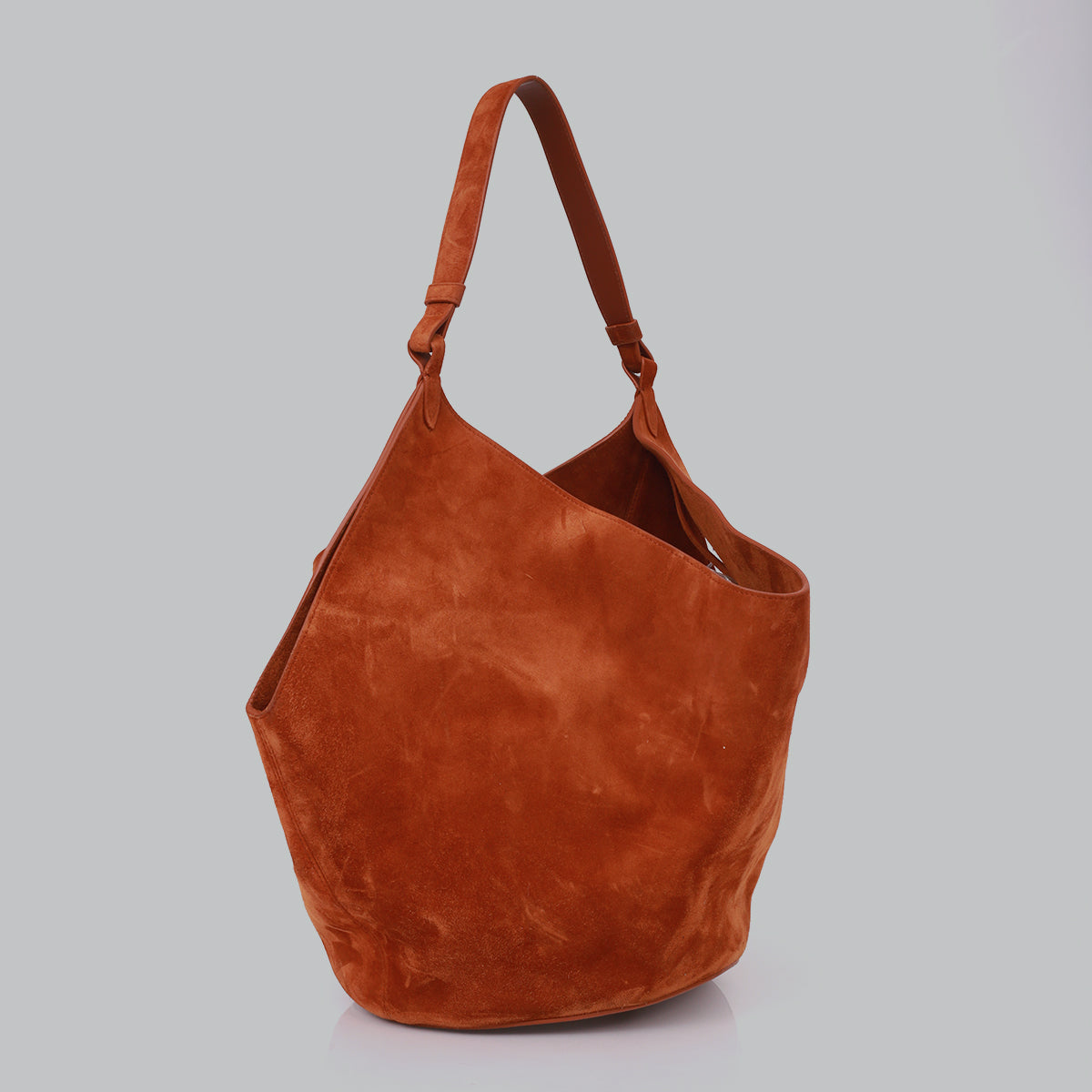 Detalhes: Bolsa Khaite confeccionada em camurça na cor caramelo. Modelo possui alça de ombro e base arredondada em couro. Compartimento interno amplo em couro na cor caramelo, com uma bolsinha no mesmo couro com fecho em zíper. Fechamento por amarração.